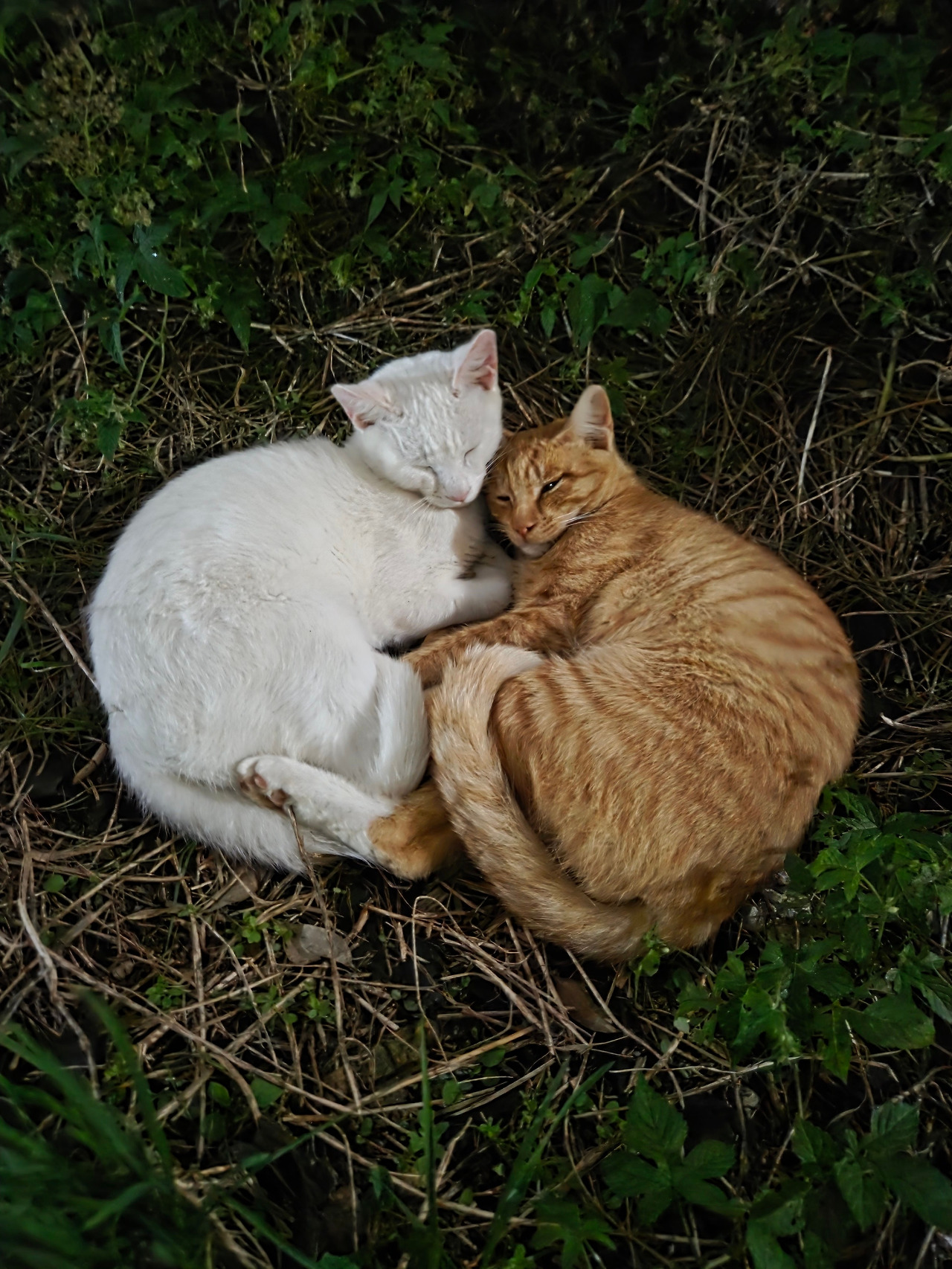 두 마리 야옹이는 서로에게 꼭 붙어 있다.