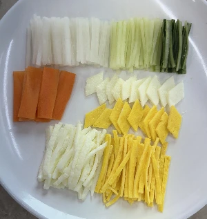수강생은 나만 남자고 6명은 모두 여성이었다. 예상한 바지만 개의치 않았다. 젊은 여성이 3명, 나랑 비슷하신 분이 3명이었다. 앞테이블은 여성 분들이 쪼르륵 앉고, 나는 호젓하게 뒷자리를 잡았다. 우리 테이블에는 좀 떨어져서 여성 한분이 앉았다. 첫 수업은 썰기다. 강사 자리로 둘러앉아 강사의 실습을 보고 익혔다.