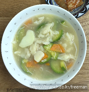 옛날 어머님이 해 주시던 수제비가 생각났다. 식구가 많아서 어머니는 반죽을 제법 많이 하고, 주걱 위에 반죽을 올린 다음 젓가락으로 끊어 물에 집어넣었다. 그래서 수제비는 가운데가 배가 부르고 뭉툭했다. 손으로 하나씩 얇게 펴서 일일이 수제비를 만들기에는 양이 너무 많은 것이다. 수제비는 주걱에서 다이빙하듯 국솥으로 들어갔다. 어린 나는 신기하게 쳐다보며 어머니의 요리쇼를 구경했다. 여러 식구를 삼시세끼 먹이려면 손이 빨라야 했다. 어머니는 식사만 챙기는 게 아니라 짬짬이 들일을 나가야 했다. 어려운 살림에 대가족을 챙기는 건 보통 일이 아니었다.