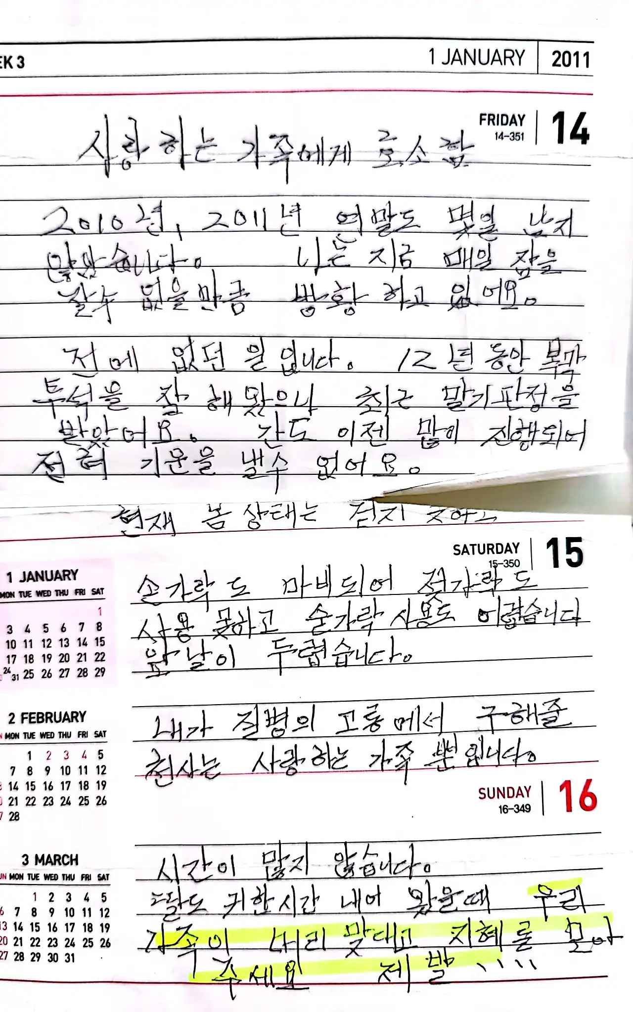 위의 편지는 아버지께서 나에게 마지막으로 보낸 편지, 말하자면 유서이다. 보통 유서하면 죽음 이후의 상황을 정리하는 내용인데, 아버지의 유서는 죽음이 아닌 삶에 대한 것이다. 삶에 대한 간절한 희망, 치열한 의지, 그리고 죽음에 대한 두려움이다.