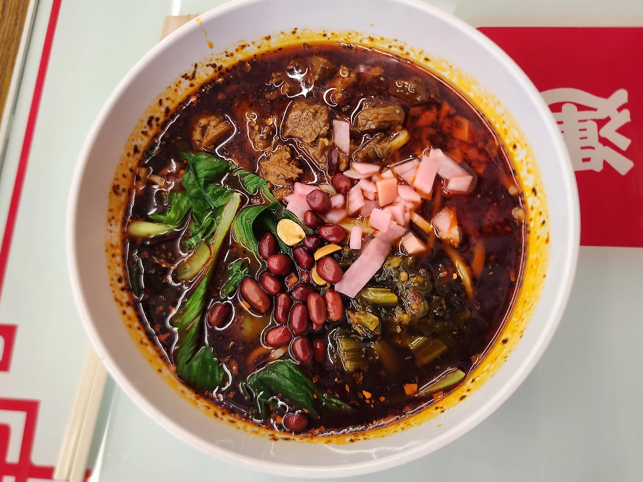 탕미엔(탕면)을 먹을까, 아니면 빤미엔(비빔면)을 먹을까 매우 고민하다가, <찡디엔 홍샤오 뉴로탕몐>을 선택했다. "찡디엔"은 정통, "홍샤오"는 "붉게(맵게) 볶은"이라는 뜻이다. 정통이라 그런지 너무 맛있었다. 정수리로부터 국물을 흡입하는 느낌이었다. 원래 면을 잘 안 먹는데 얼마 남지 않은 면을 비비작 대다가 너무나 탱글탱글하고 간이 잘 배어있는 그 면들을 한숨에 내 위로 초대하였다. 옆에서 식당 아주머니가 날 신기한 듯 바라보고 있었다. 하, 중국은 별로고, 대중국 외교는 어려운데, 중국 음식은 맛있다...