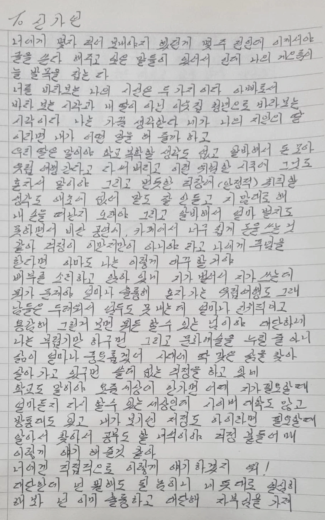 “우리딸은 말이야 학교 복학할 생각도 없고 알바해서 돈 모아 유럽 여행간다고 다 써버리고 이런 위험한 시국에 그것도 혼자서 말야. 그리고 번듯한 직장에(안정적) 취직할 생각도 애초에 없어, 말도 잘 안듣고 지 맘대로 해. 내 손을 떠난지 오래야. 그리고 알바해서 얼마 벌지도 못하면서 비싼 공연에, 카페에서 너무 쉽게 돈을 쓰는 것 같아. 걱정이 이만저만이 아니야”