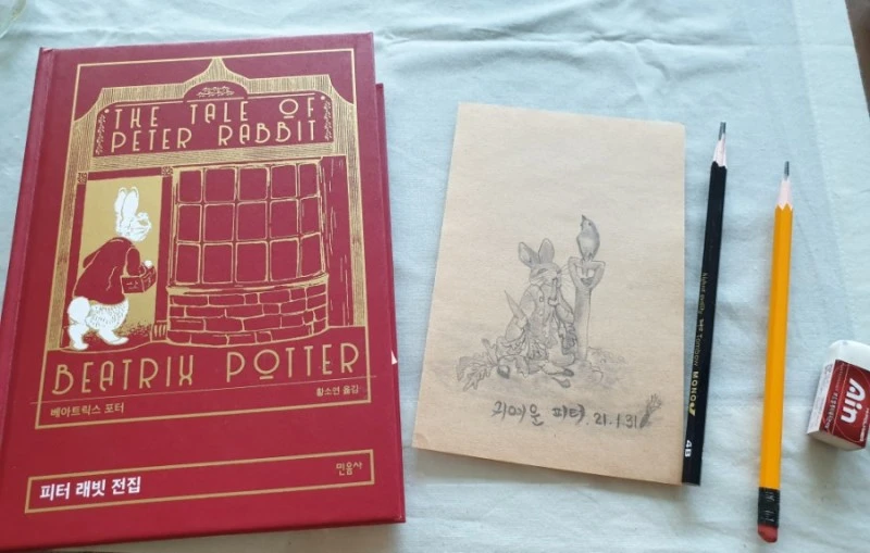 다시 봐도 통 크게 맥그리거 아저씨네 텃밭에 들어가 상추도 먹어 보고 강낭콩, 순무를 먹는 장난꾸러기 피터는 볼수록 매력덩어리다. 피터를 보면 자연과 동물을 사랑했다는 베아트릭스 포터의 마음이 어느 정도였는지 짐작할 수 있다. 피터를 따라 그리면서 연신 피식피식 거렸던 기억이 나서