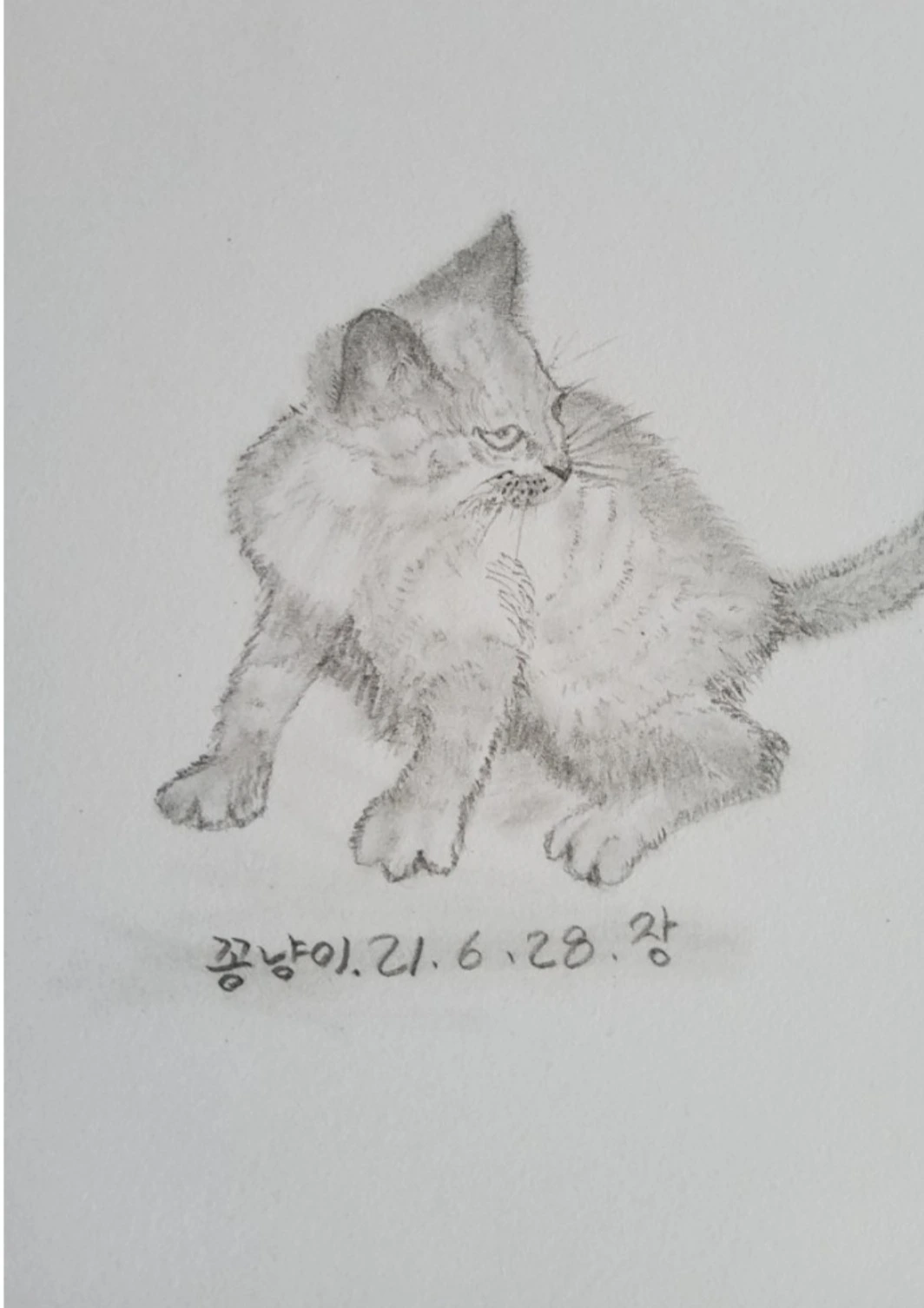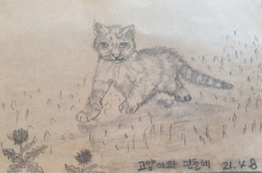 그렇담, 봄이는 어떻게 됐을까. 어디서 밥은 먹고 다닐까. 살아있기나 한 걸까. 살아있다면 지금쯤은 아기 티를 벗었으려나. 앞으로도 봄이를 영영 못 볼 수 있지만, 후회가 밀려온다. 사진이라도 몇 장 찍어둘걸. 어디서든 봄이가 건강하게 살아가기를 바라며 드로잉 북을 펼쳤다. 봄이랑도 닮았을 것 같은 녀석을 그린 그림이 떠올라서다. 봄이가 이 녀석만 했었다. 이 녀석은 어느 봄날 민들레와 놀던 아기 고양이다. 하는 짓이 하도 귀여워 그렸었는데 그림에서 언뜻언뜻 봄이가 보인다. 그래서 제목을 고쳤다. 봄이가 우리 집에 안온 이유로 했다가 못 오는 이 유로로.