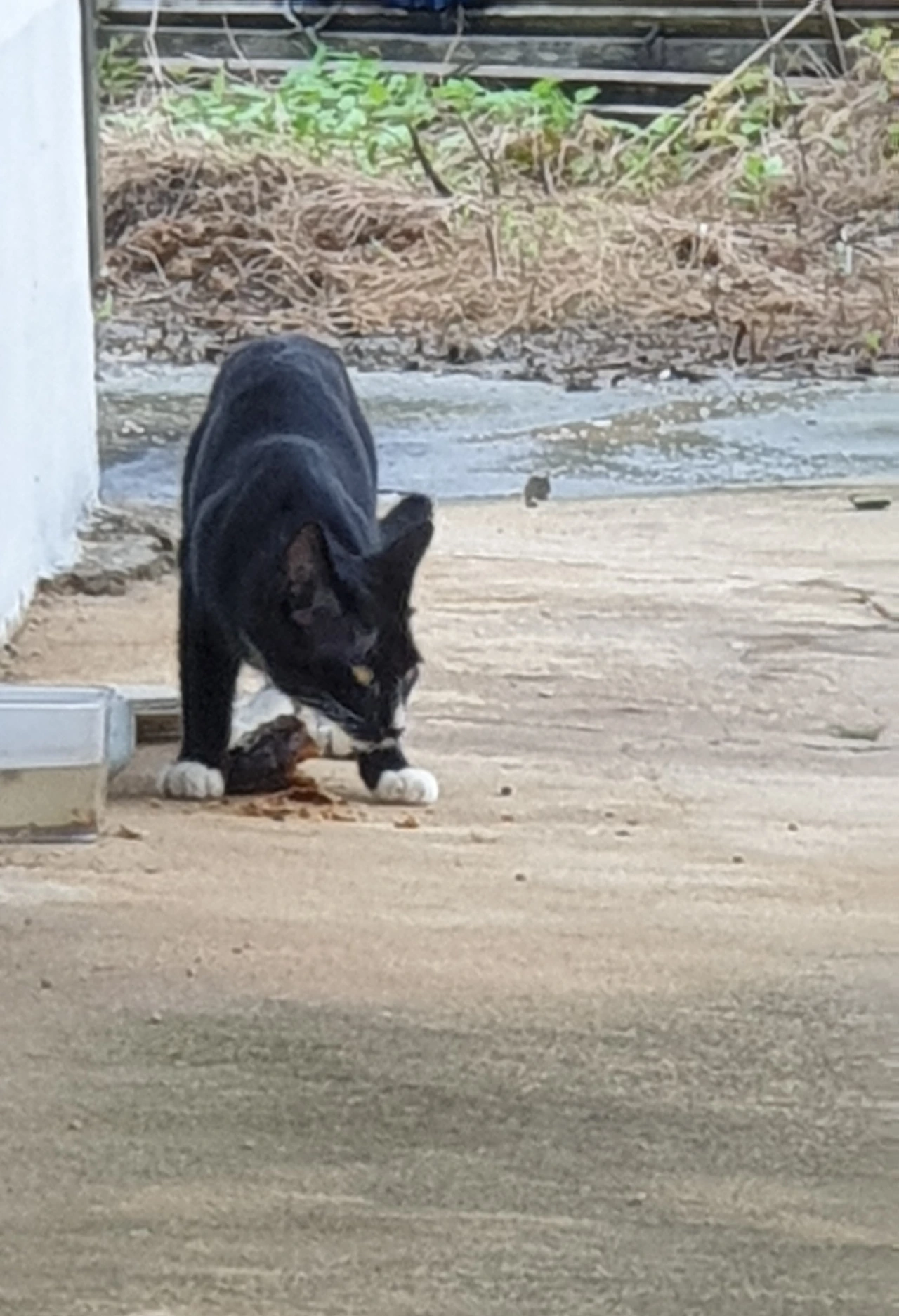 여느 때 같으면 밥 먹을 때도 경계를 늦추지 않고 주변을 힐끔거리고, 밥 먹다가도 내 인기척에 놀라 핫바지에 방귀 세듯 간지 모르게 개구멍으로 달아나곤 했는데, 오늘은 녀석이 아주 여유 만만이다. 대문으로 걸어 들어와 아침을 먹고 있다.