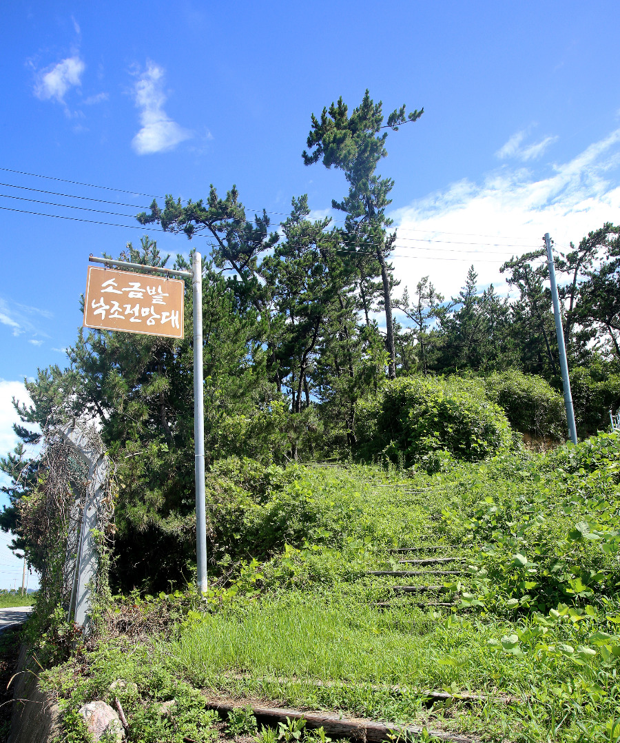 가게를 나와 곧장 나무 계단을 따라 야트막한 동산을 오르면 낙조 전망대에 이른다. 낙조전망대는 한 번도 오지 않은 사람은 있겠지만 한 번만 온 사람은 없을 것 같다. 십 여분 남짓 소요되는 등산 코스를 오르는 동안 각종 식물이 주는 아름다움으로 충만하다. 정상에 올라 둘러보니 증도의 모든 것이 한눈에 들어온다. 산 아래 옹기종기 집들이 마치 성냥갑 같다.