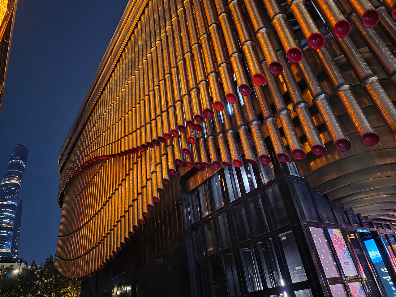 푸싱 아트센터 파이트 같은 세겹의 커튼 외벽이 음악에 맞춰 돌아간단다.