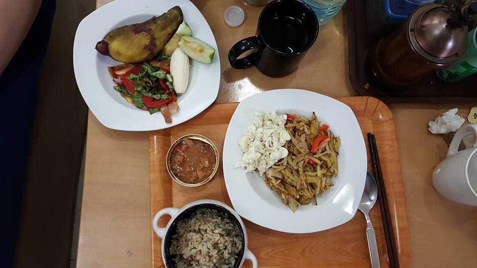 아침식사 감자채 볶음, 스크램블, 풀풀 날리는 길쭉한 현지 현미밥, 참치 캔, 딸은 고구마, 사과, 바나나, 남은 피자