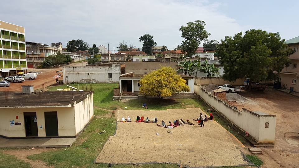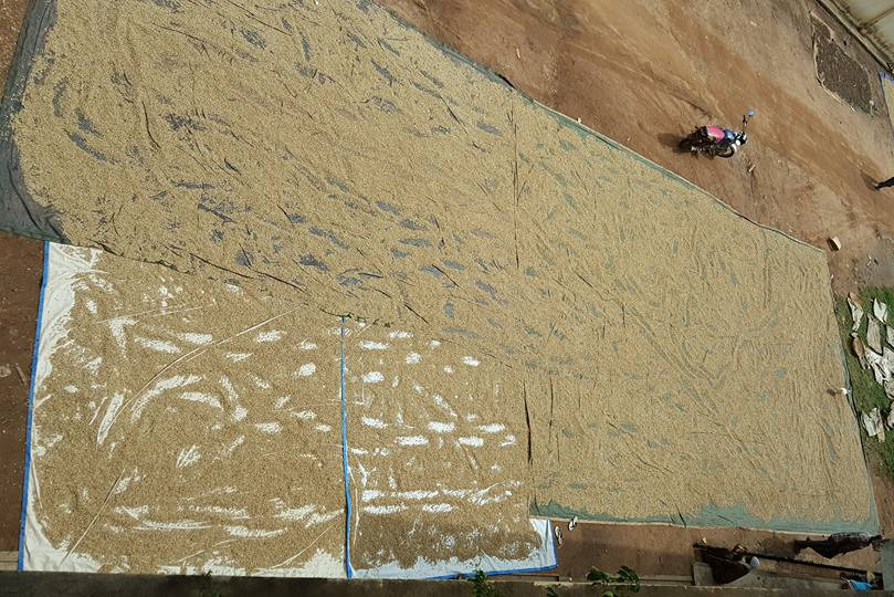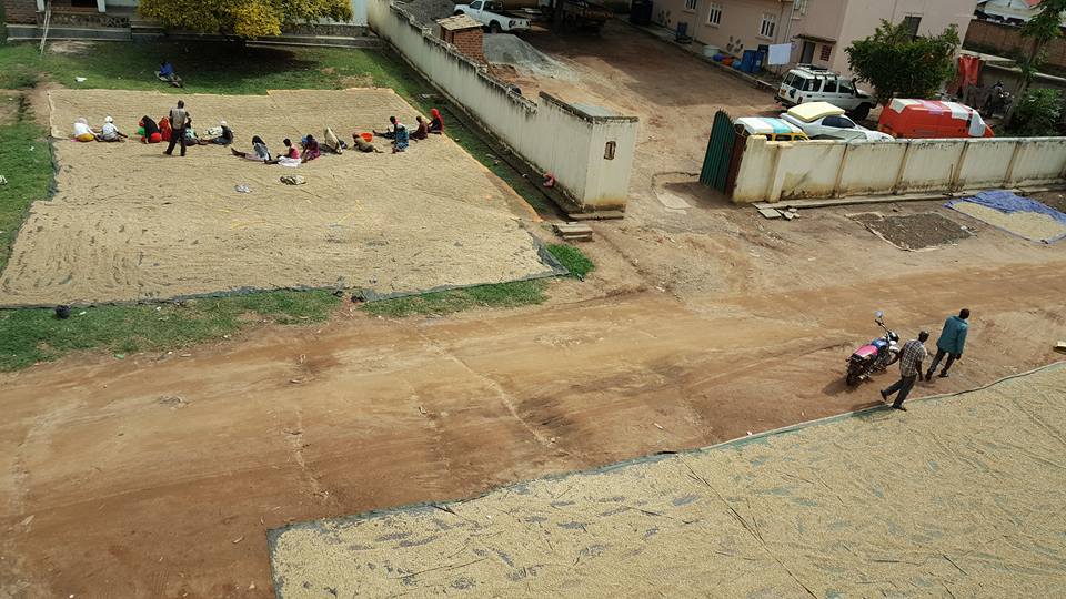 날씨가 개이면 공터에 커피콩을 널어 말린다.