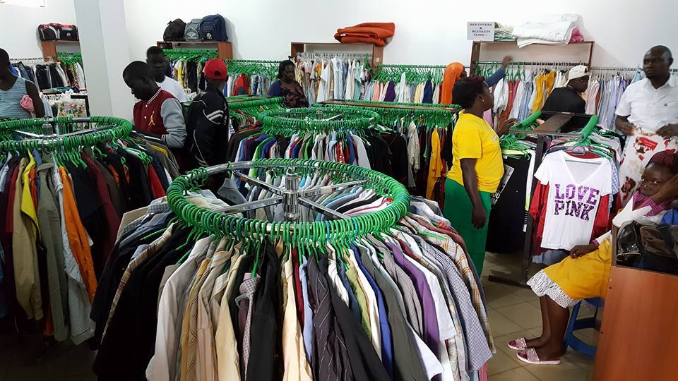 8. 옷걸이 빽빽이 걸려 있는 구제물품들. 젊은 사람들, 주부들이 많이 보인다. 신발도 있다.