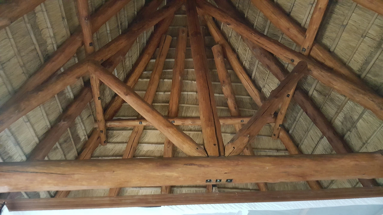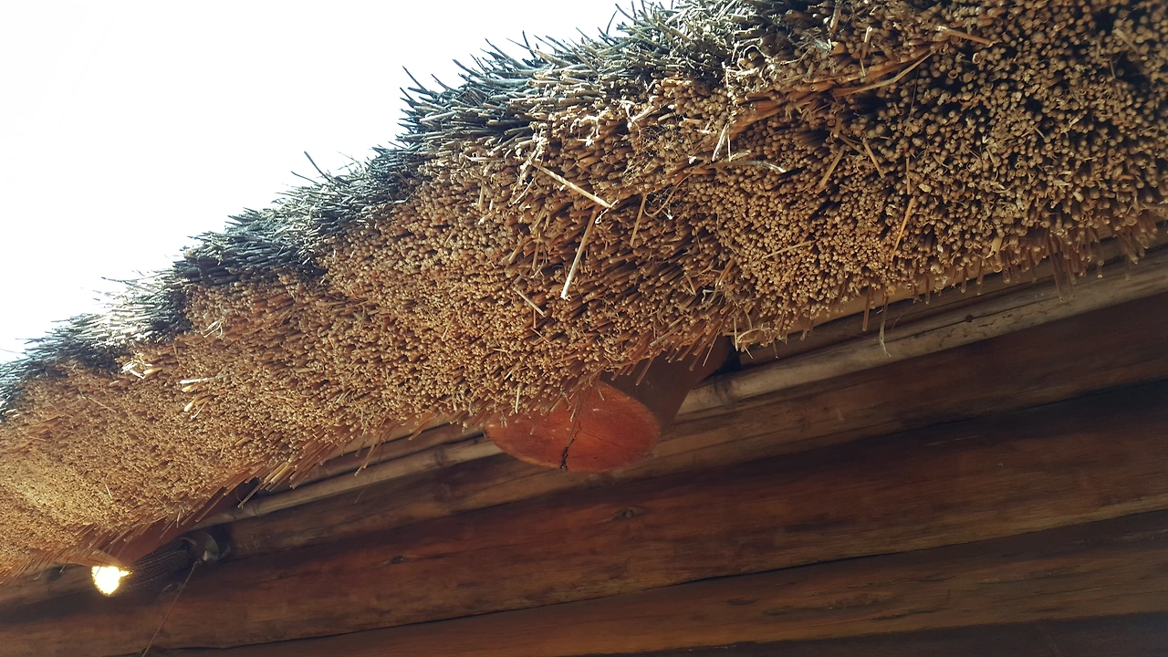 벽도, 석가래도 완전 통나무로 지었다. 두께가 20cm는 되고도 남을 볏짚 지붕도 사람이 다 올렸다고 한다.