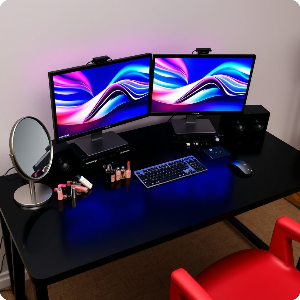 검은색 책상과 의자, 두 개의 모니터, 알 수 없는 장비들이 온몸으로