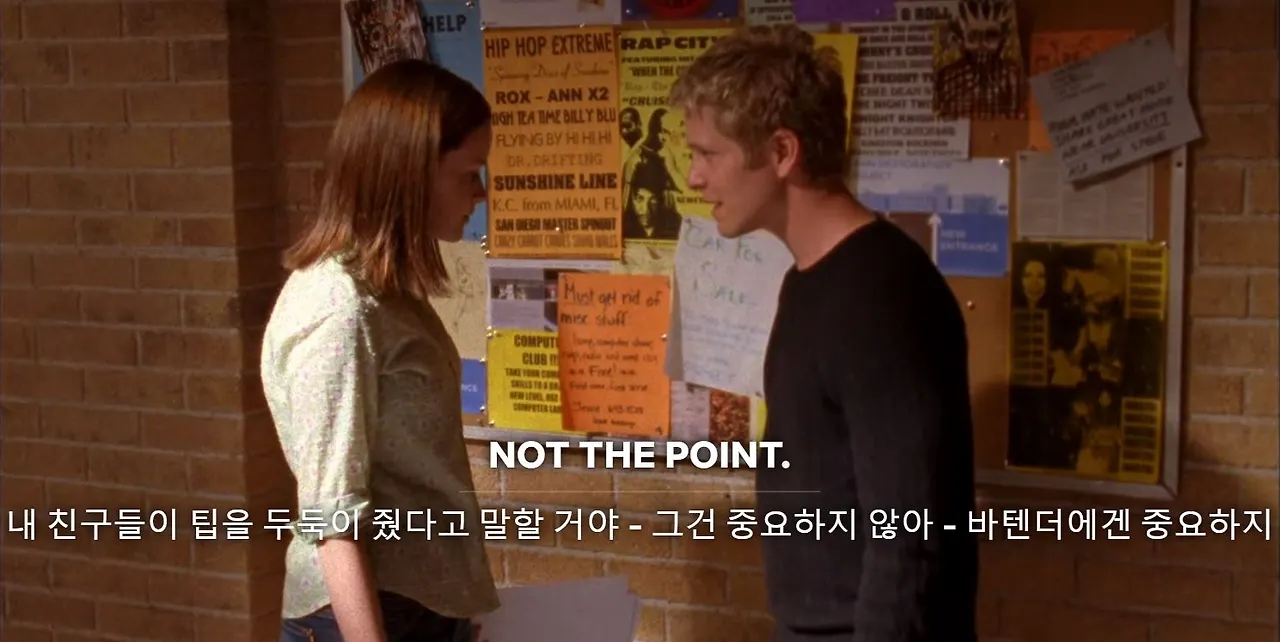 미드 <길모어걸스>의 장면으로 이 불편한 문화를 조금 더 와닿게 설명해 드리겠습니다.