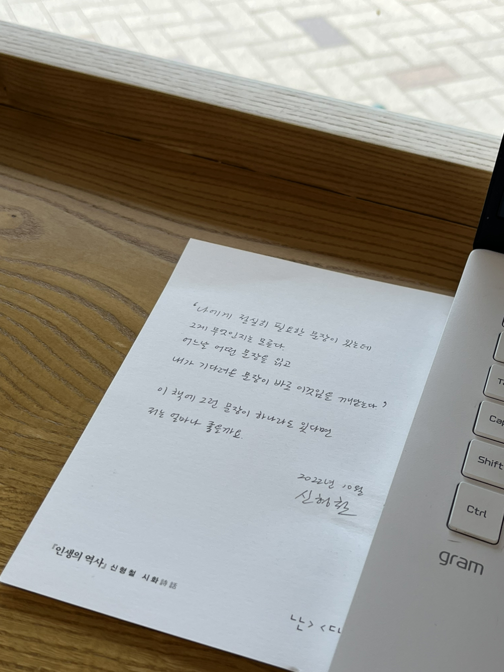 저는 최근 ‘인생의 역사(신형철)’에서 한동안 빠져나오지 못했답니다. 다른 책을 읽어도 제 정신의 거대한 줄기는 ‘인생의 역사’를 붙잡은 채, 새로운 책을 읽어도 잠시 기분을 산뜻하게 만들어주다 휘발되었어요. 책을 다 읽고 가장 기억에 남는 내용에 물성을 주며 털어낸다면 어떤 내용이 떨어질까 생각해 보았어요. 프로스트의 시 ‘가지 않은 길’에 대한 새 해석이었습니다. 이 시는 주로 정치인이나 대학 교수 등 남들이 쉽게 선택하지 않은 분야에서 한 업을 이루신 분들이 은퇴식에서 낭독하는 시로, 선구자적 면모를 드러내는 시로 알려져 있습니다. 고등학교 문학시간에 이 시를 배우면서 교과 선생님께서 다들 가고 싶어 하는 학과 말고 비전 있는 학과를 선택하라고 말씀하셨던 기억이 나네요. 그런데 이 시에는 통일성을 해치는 하나의 연이 있습니다. 2 연입니다. ‘물론 인적으로 치자면, 지나간 발길들로/두 길은 정말 거의 같게 다져져 있었고.’ 부분입니다. ‘숲 속에 두 갈래 길이 나이 있었다고, 그리고 나는-/사람들이 덜 지난 길 택하였고/그로 인해 모든 것이 달라졌노라고.’를 기억하는 독자의 감동에 위배되는 내용입니다. 이 부분을 두고 데이비드 오어는 '우리가 우리 인생을 하나의 이야기로 구축하려 할 때 범하게 되는 자기기만적인 논평'이라고 평합니다.