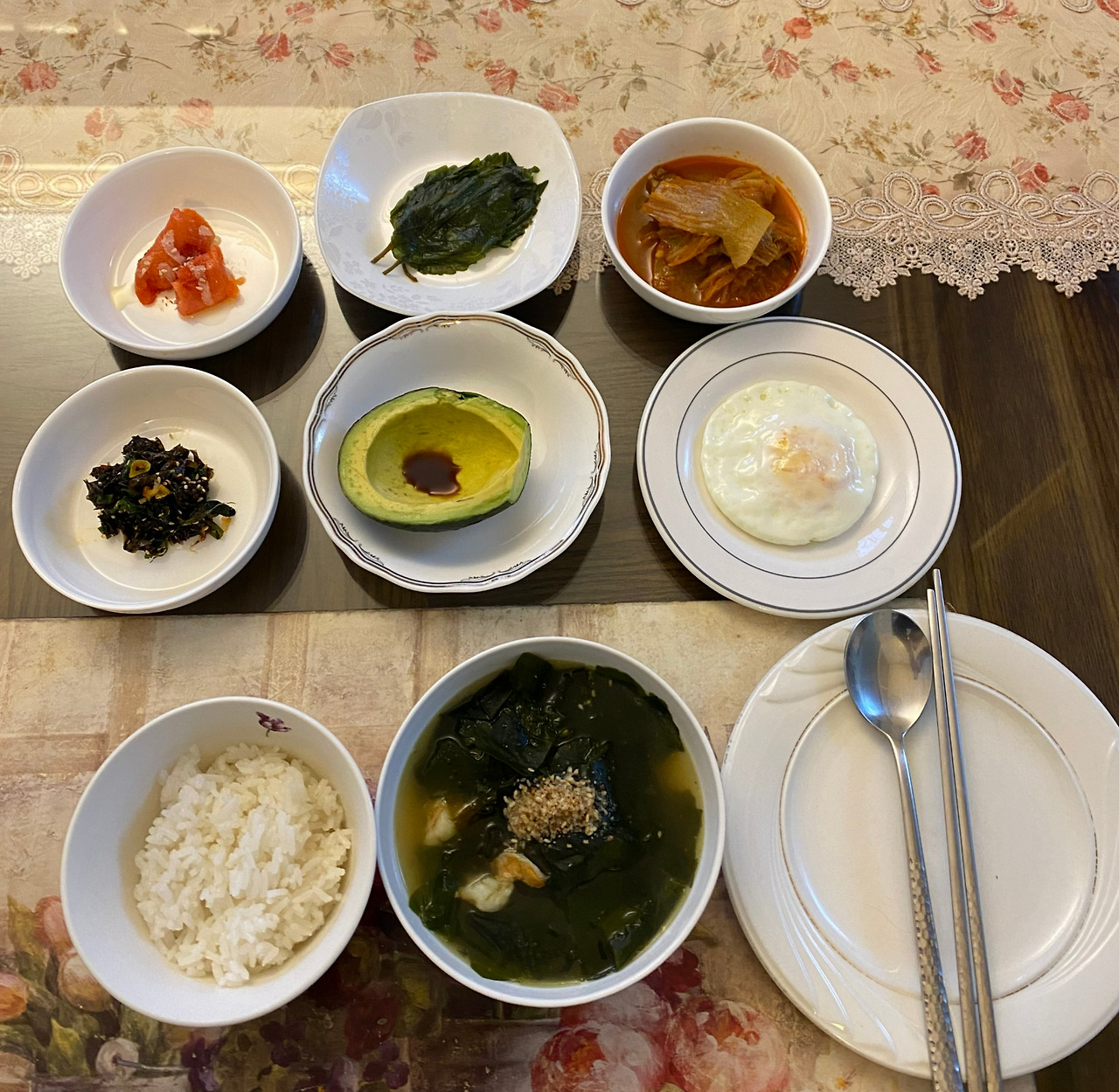 문 밖에 들리는 쉼없는 개 짖는 소리, 풀벌레 소리, 저벅저벅 텃밭을 가꾸는 일꾼들의 여유 있는 걸음 소리는 새벽이 다 닳아 아침이 오고 있음을 느끼게 했고, 나는 마치 무조건 지켜야 할 약속처럼 7시가 되자 아침식사를 위해 안채로 들어가 밥상에 앉았다. 깔끔한 사기 접시에 담긴 몇 가지 반찬이 차려진 후 약간의 김이 모락모락 올라오는 따끈한 국물이 내 앞에 놓였다, 미역국 -