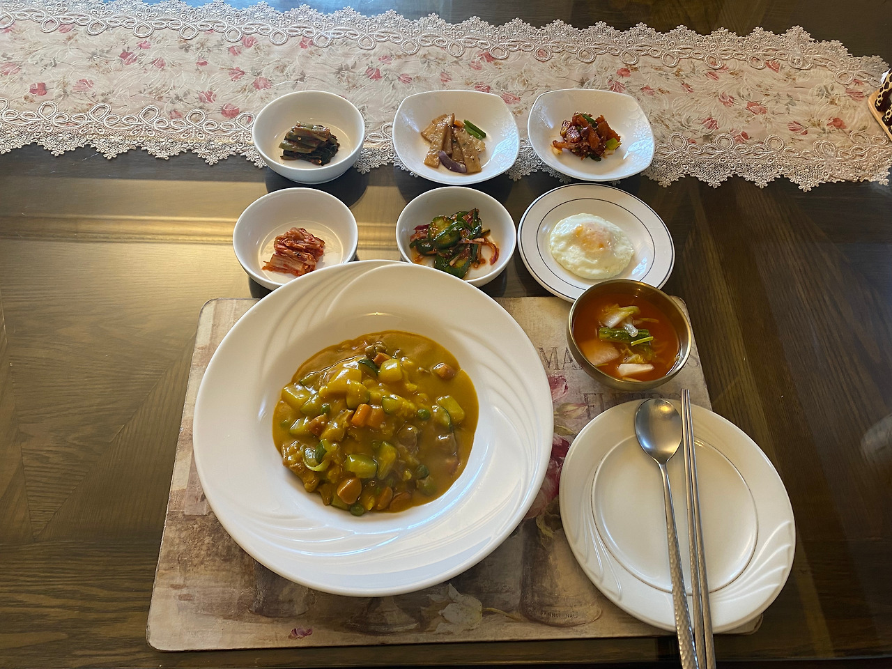 뭔가 아침식사와 어울리지 않은 것 같은 음식 나왔다, 커리.
