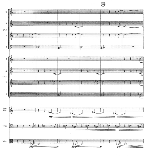 위 악보에서 서로 다른 시간의 층위에서 미묘하게 어긋나는 음들이 겹쳐지며, 투명하고 감각적인 음향의 표면이 형성되는 과정을 확인할 수 있다. 134마디부터 시작되는 팀파니의 오스티나토가 규칙적인 패턴을 형성하는 가운데, 두 개의 합창 그룹과 알토 솔로가 시간차를 두고 포개진다. 전 음역대에 걸쳐 D–B 혹은 D♭–B♭ 음정이 교차하듯 중첩되며, 저음에서 지속되는 비올라의 D♭음과 합창의 D–C–B 하행이 더해져 총 네 개의 음으로 구성된 밀집된 음향층이 형성된다.