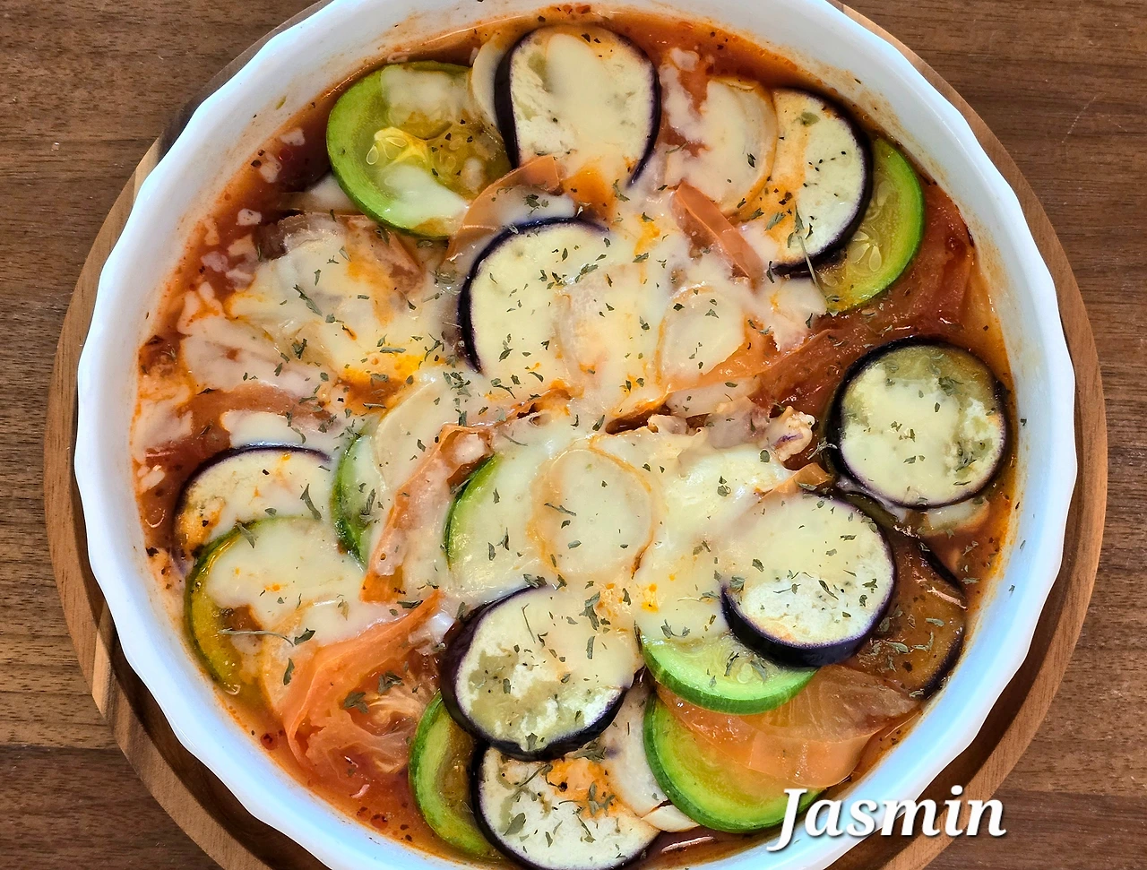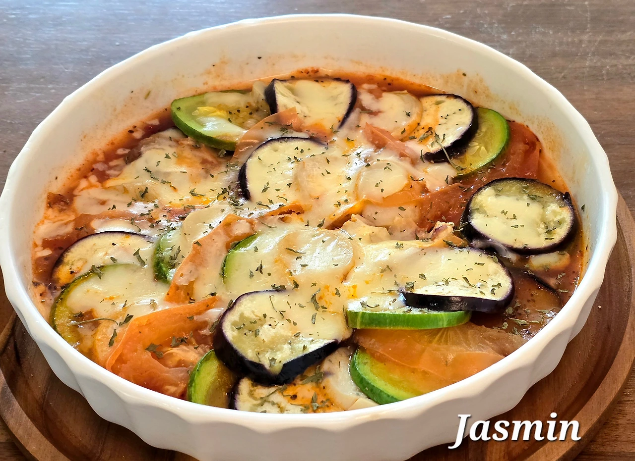 그리고 그릇 바닥에 토마토소스를 얇게 깔아주고,그 위에 썰어둔 채소들을 하나씩 겹쳐가며 올리면 돼.