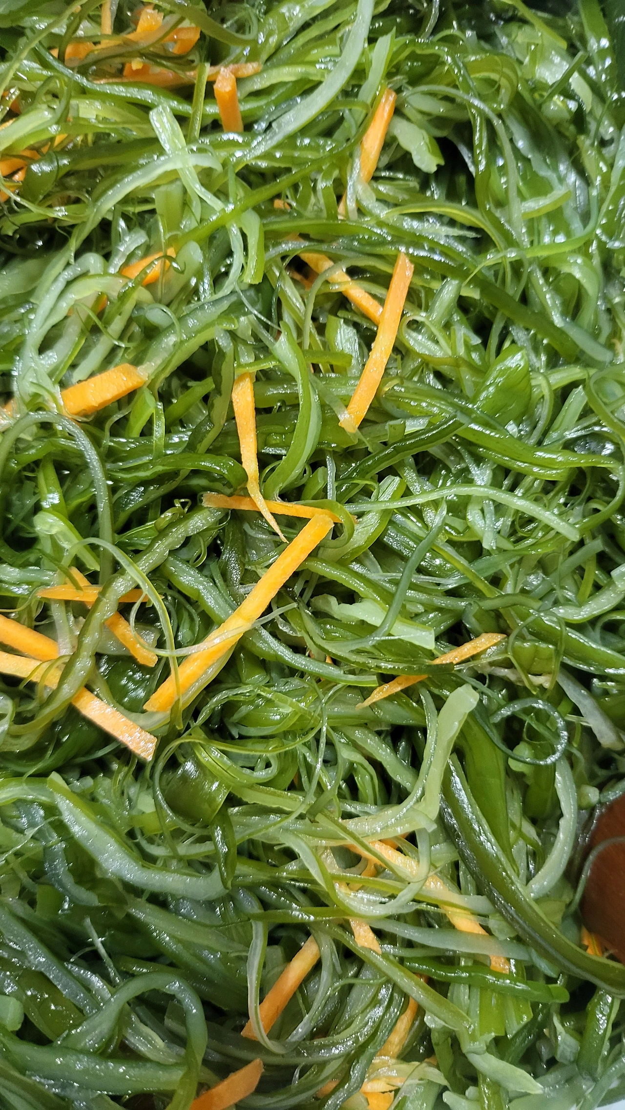 미역줄기 1kg을 볶아서 서울로 가는 버스에 탔다. 지난 21일 화요일 12 시 43분 손자 덕둥이가 태어났다. 나는 휴가를 내기 어려운 방과후 강사라 출산일은 가지 못하고 24일 수업을 마치자마자 짐을 챙겨 일산 행신동 아들 집으로 향했다. 출산 이틀째인 22일에는 남편과 제주도 사는 땔이 손자를 보고 왔다. 2박 3일 만에 신생아는 집으로 온 것이다. 짐이랑 산모랑 아들 혼자 수고한 것이 안타깝긴 했다. 42세에 올라 아들을 봤으니 아들은 힘든 것도 모르고 뛰어다녔을 것이다. 무슨! 반찬이 먹고 싶은지 물어보니 미역줄기를 해 달라교 했다. 22일 퇴근해서 미역줄기를 볶고 우엉과 연근을 사 놓은 것이 있어 다듬어 조림반찬을 만들었다. 24일 같이 사는 막내와 내가 가서 신생아를 돌보고 28일 남편과 제주도 딸이 올라와 아기를 본 후 두 딸은 호텔로 가고 남편과 내가 남기로 했다.
