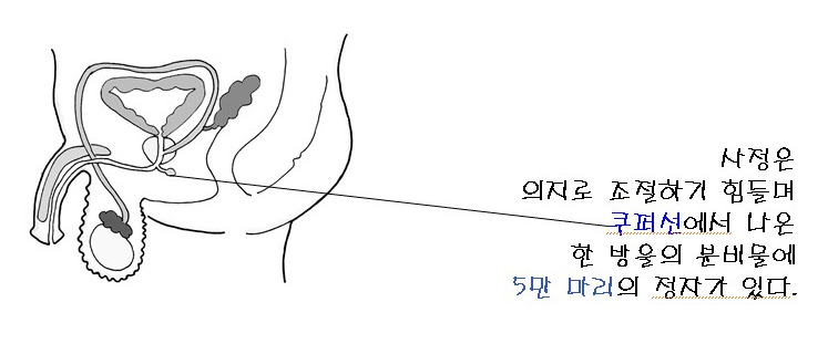범인은 바로 그림처럼 요도구 뒤쪽에 위치한 한 쌍의 완두콩 크기의 서양배 모양의 분비선인 쿠퍼선이다.