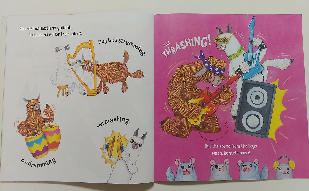 준비하는 과정은 생각과 달리 녹녹하지 않아요. 하프도 튕기고, 드림도 치고, 심벌즈도 두드리고, 열정적인 록 음악까지 연주합니다. (They tried strumming, and drumming and crashing and thrashing!)