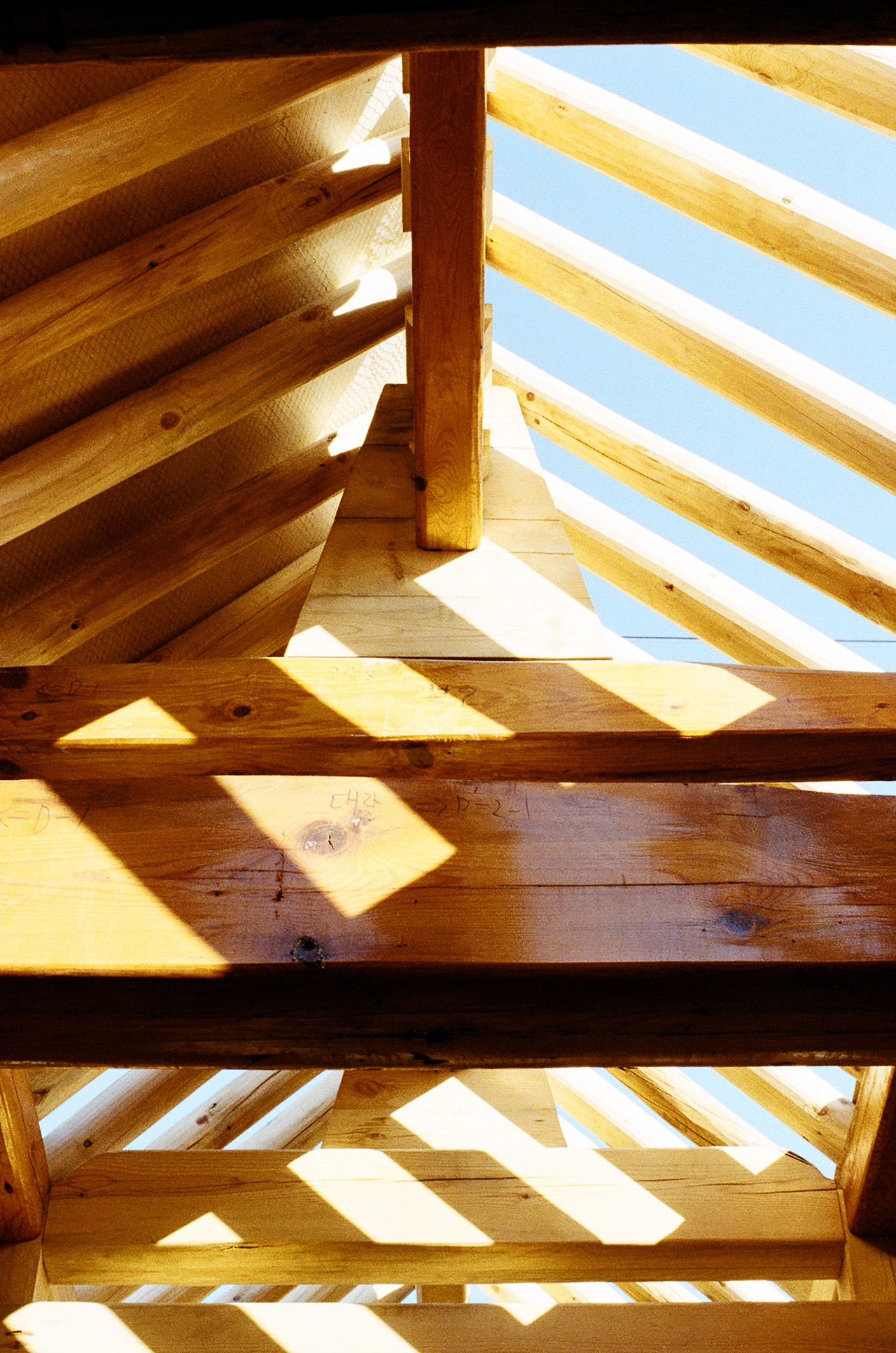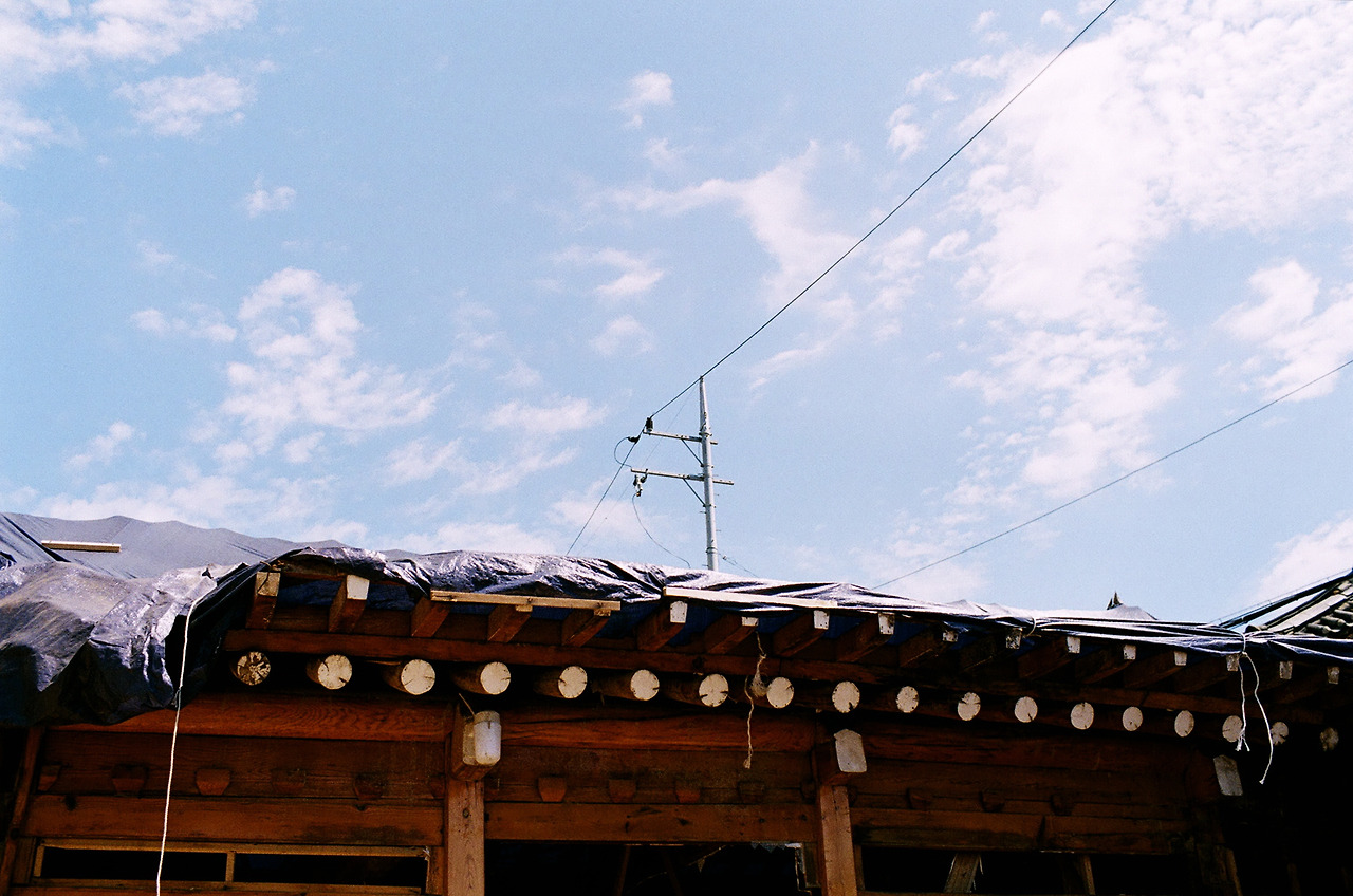 개와(蓋瓦)를 한 적은 있어도 지붕 수선을 대대적으로 한 적은 없는 집이었기에, 90여 년 전 지어진 이래 천장이 열린 적은 없었다. 이번에 대수선 과정을 거치며 몇 달간 온몸에 볕을 함뿍 받고는 이제 새 지붕이 올라갈 시간. 서까래 사이로 보이는 하늘과, 하오의 따스한 햇빛이 아름다웠다.