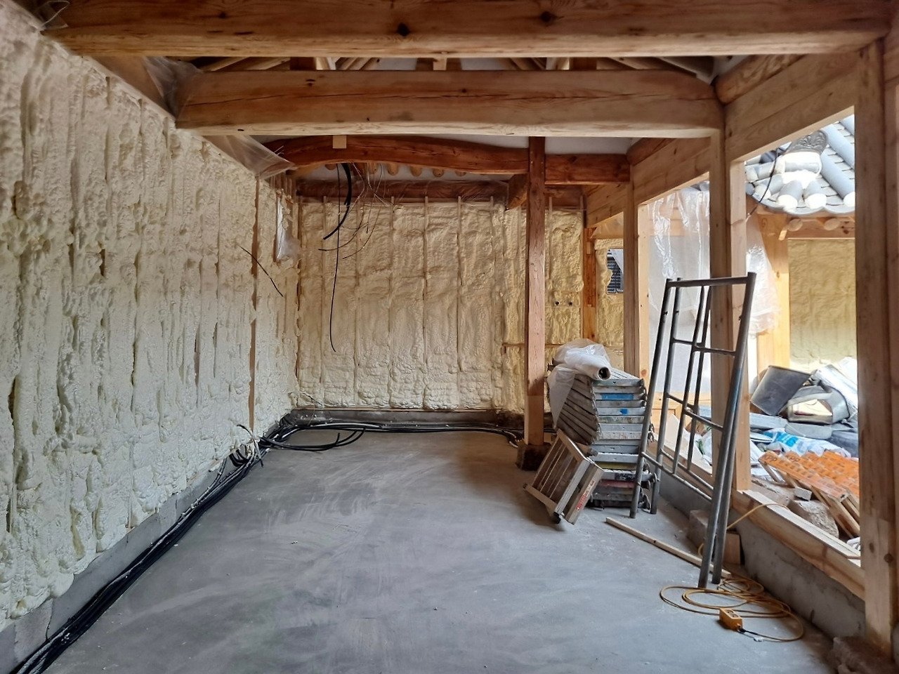 몽글몽글(2023), 선한공간연구소+서울한옥이렇게 해도 창호가 많은 한옥의 특성상 패시브 하우스와 같은 열효율을 얻어낼 수는 없지만, 그래도 머리맡에 두고 잔 물 한 컵이 밤새 꽁꽁 얼어버리는 상황 정도는 너끈히 막아낼 수 있다.