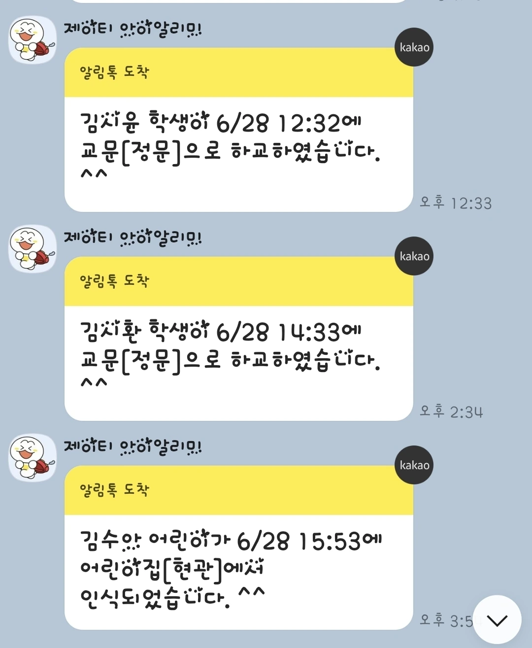 요즘은 학교 등하교 시에 알림 정액권을 소액 지불하면 초등 졸업까지 가방에 열쇠고리 같은 텍을 통해 서비스를 받을 수 있다. 대부분 사설 학원들도 입실 퇴실에 대한 문자 알림을 서비스해주고 있기에 학원 땡땡이는 천재지변, 병가, 학원의 코로나 소독 등 특정일이 아닌 이상 절대 상상 못 할 일이 되었고, 두뇌가 열 일하는 아이들도 한두 시간 학원 땡땡이로 얻는 즐거움보단 엄마의 레이저 쏘는 눈빛을 맞으며 독대하여 학원 땡땡이의 정당한 이유를 프레젠테이션하고 며칠간 게임 중지할 건지 스스로에게 벌을 직접 내리는 게 훨씬 잃을 것이 많다는 걸 잘 알고 있다. 물론 몇 번의 눈물 콧물 나오는 시행착오를 반복해야만 아이들이 받아들이는 건 어쩔 수 없는 필수 과정이다.