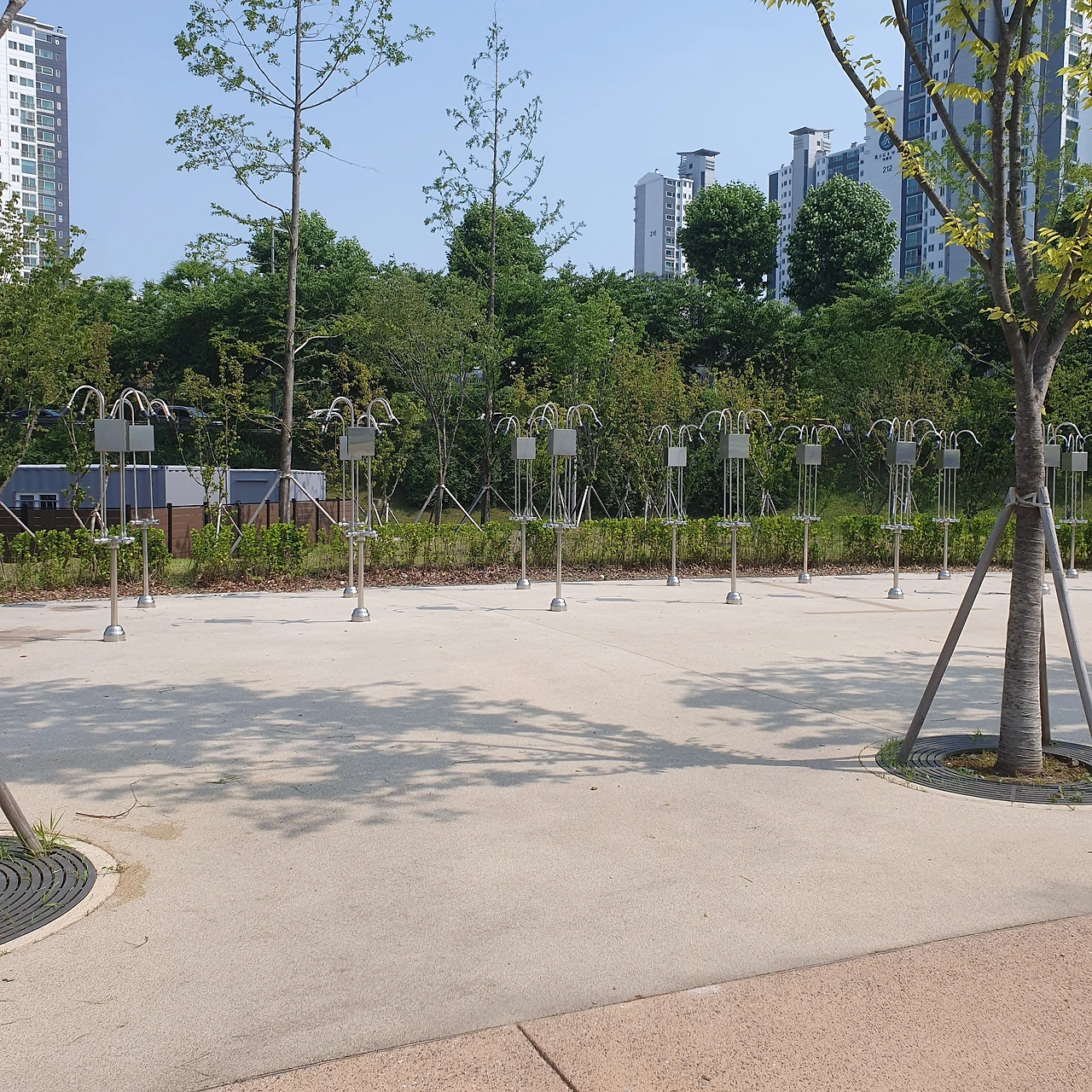 분사 노즐과 연잎 모양의 조형물이 햇살을 받으며 반짝였다.