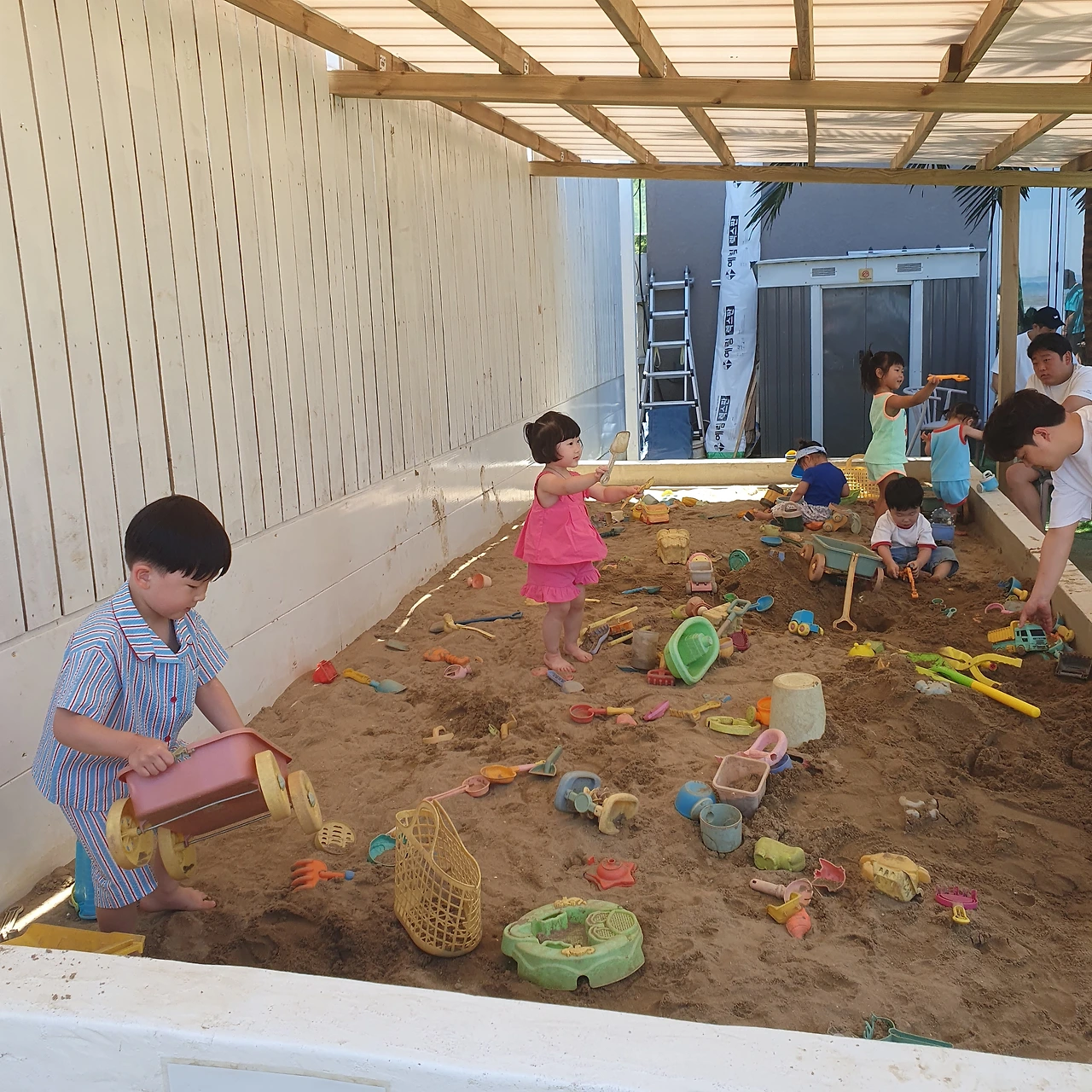 아이들은 모래 놀이터에서 신나게 뛰어놀고,