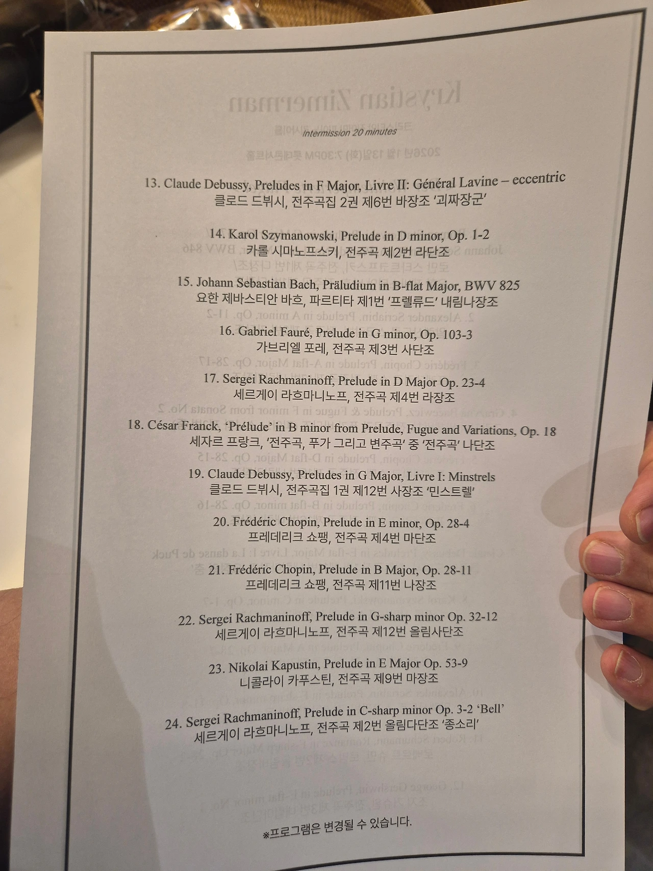 몇 번의 무대 인사 후 그가 드뷔시의 곡을 앙코르로 연주하였는데, 마침 나의 지난해 연주곡과 같은 곡(드뷔시, 아라베스크 1번)이어서 더 세밀하게 들을 수 있었다.