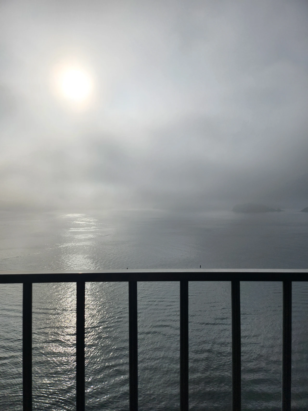 올해 여름, 호텔 발코니에서 바라본 해무가 자욱한 통영바다