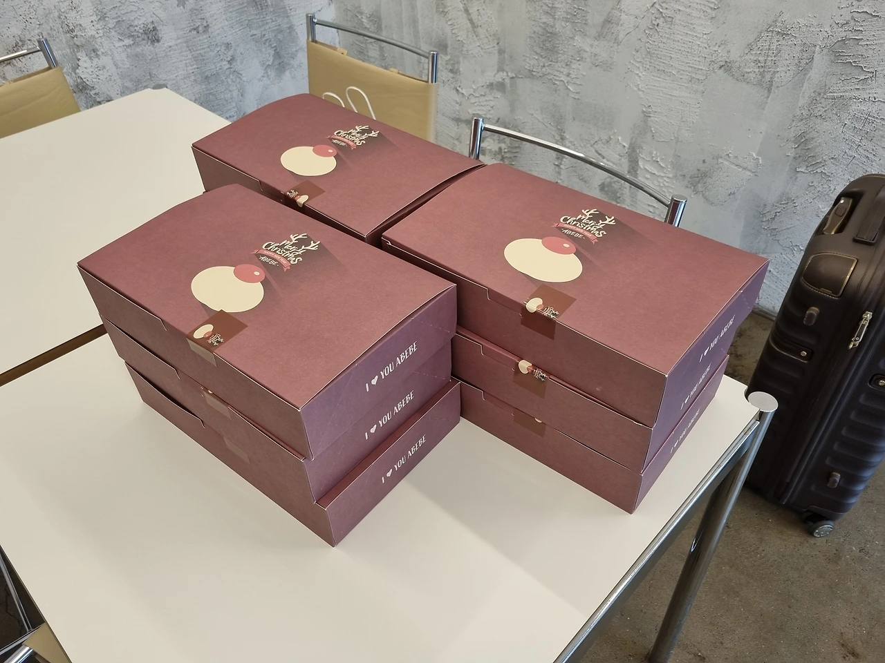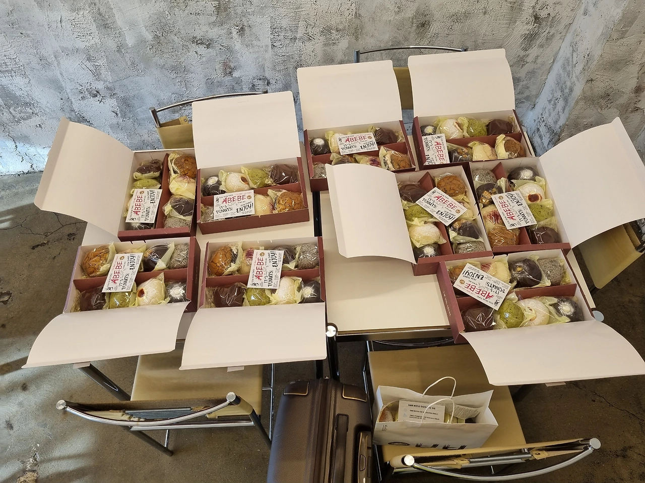 각각의 선물을 준비하면서 스토리도 생겼다. 도넛을 준비할 땐 양이 대단할 것이란 걸 예상해서 여행용 대형 캐리어를 가져갔고, 캐리어에 차곡차곡 쌓아서 담아왔었다.