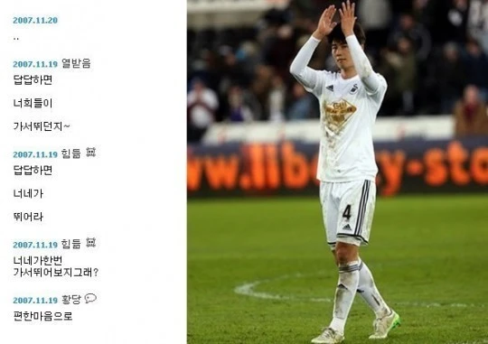 사람위에 사람은 존재하지않는다 축구선수가 공인이라 당연히 비판하는 이 들에게 꼭 한마디하고 싶다 축구선수는 공인이아니다. 자신의 실력에 따라 연봉받고 노동을 하는 노동자이며 유명한 사람일 뿐이다. 당신네들의 이익을 보호해야하고 당신네들의 욕까지 감당해야할 이 들이 아닌 것이다. 도대체 당신네들의 그 욕은 어디서 정당성을 찾는지 알 수가 없다.