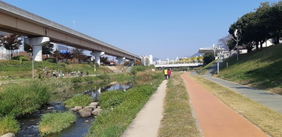 1호선을 계속 가다 보니 수영역이 나온다 수영역 지역에서 해운대 벡스코 넘어가는 길에 너무너무 나 멋진 다리가 나온다. 이 다리는 약간 서울의 청계천을 보는 듯한 루트를 띄기도 한다. 이 길을 연인과 함께 걷기를 바란다