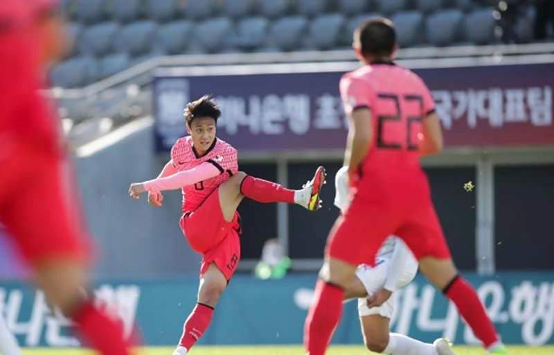 전반은 이른바 한국대표팀의 파상공세였다. 전반 24분 백승호의 침투 패스를 이어받은 조규성은 환상적인 터치로 위협적인 위치로 볼을 옮겨 놓았다. 이에 대해 수비가 태클을 시도하자 조규성은 볼을 접는 과정에서 발에 걸려 넘어짐으로써 페널트킥이 선언되었다. 하지만 키커 권창훈이 이를 실축하였다. 하지만 얼마 후 전반 26분 중앙에서 쇄도하는 권창훈을 본 이동경이 로빙패스를 하였고 권창훈은 이를 환상적인 터치로 자신의 왼발 앞에 놓은 후 침착하게 골을 성공시켰다.
