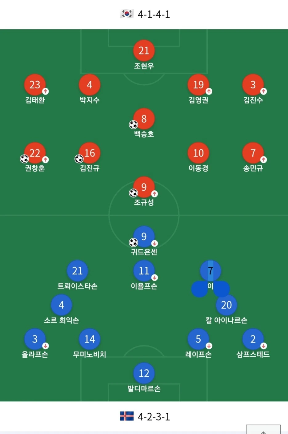 하지만 이후 한국의 공격은 주춤했다. 그리고 아이슬란드는 후반 수비수 레이프손을 올라프손으로, 수비수 삼프스테드를 미드필더 잉가손으로 바꾸고 전술적 변화를 주어 역전의 발판을 마련하고자 하였다. 반면 벤투는 김영권 대신 정승현으로, 김진수 대신 홍철을, 권창훈 대신 이영재를 투입함으로써 다양한 선수를 시험하는 방향으로 후반을 맞이하고자 하였다.