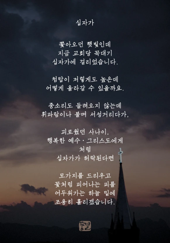 윤동주의 대표적인 시 십자가15세 때부터 시를 쓰기 시작하여 첫 작품으로 <삶과 죽음> , <초한대>를 썼습니다. 발표 작품으로는 만주의 연길(에서 발간된 《가톨릭 소년》지에 실린 동시 <병아리>, <빗자루>, <오줌싸개 지도>, <무얼 먹구사나>, <거짓부리> 등이 있습니다. 연희전문학교에 다닐 때에는 《조선일보》에 발표한 산문 <달을 쏘다>, 교지 《문우(文友)》지에 게재된 <자화상>, <새로운 길>이 있다. 그리고 그의 유작인 <쉽게 씌어진 시>가 사후에 《경향신문》에 게재되기도 하였습니다(1946).