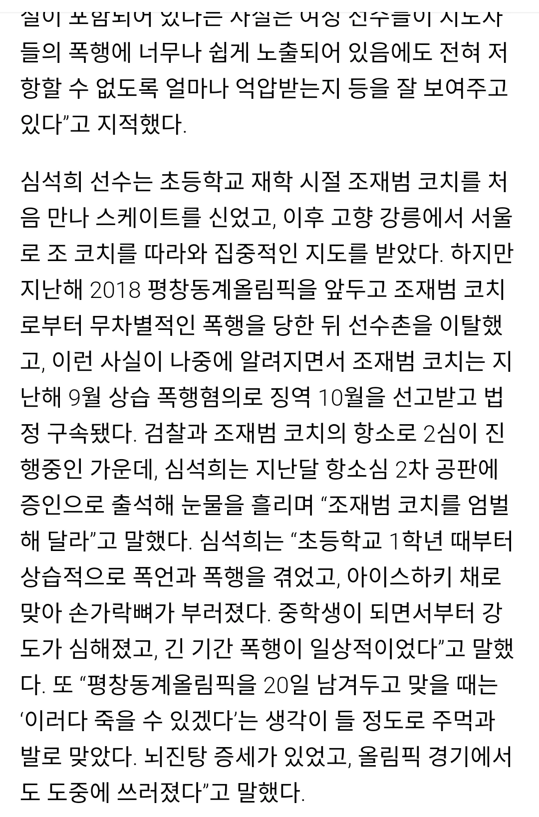이 인간 금수는 심석희가 17살 때부터 폭행과 성폭행을 했다고 한다. 인간금수는 현재 10년 6걔월형을받고 복역중이다생각해보라. 그녀가 성인도 되기전에 자신이 원하지 않는 사람이 자신을 폭행하는 상황을. 이 코치란 작자는 자신의 지위를 이용해서 성인도 되지않은 이에 대해 폭행은 물론 성폭행까지 했으니 인간 말종이라 해도 괜찮을 것이다. 그것도 17살부터 약 4년간 성폭행을 상습적으로 당했다니, 더 말을 하서 무엇인가. 그녀의 슬픔과, 가족들의 분노를 달래주기 위해서 거세라도 해야하지말이다 관련 기사는 아래와 같다.