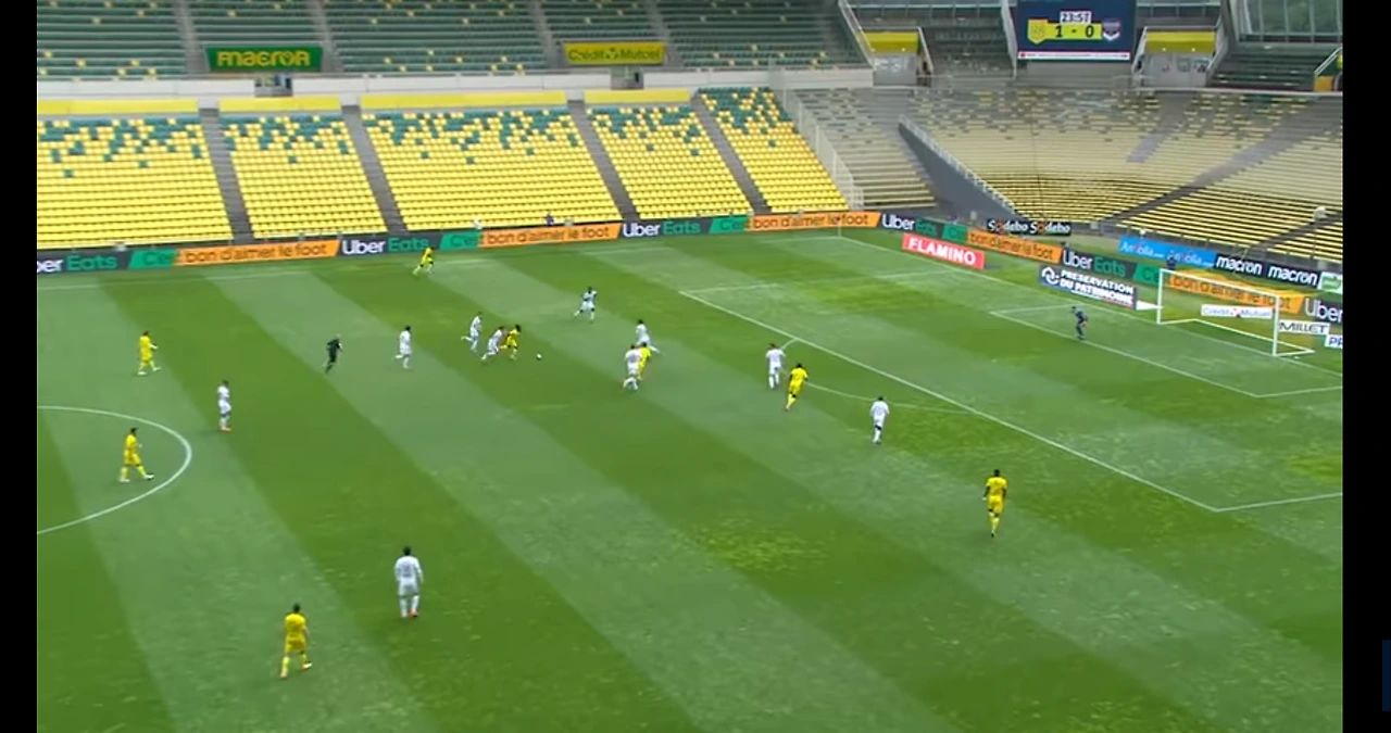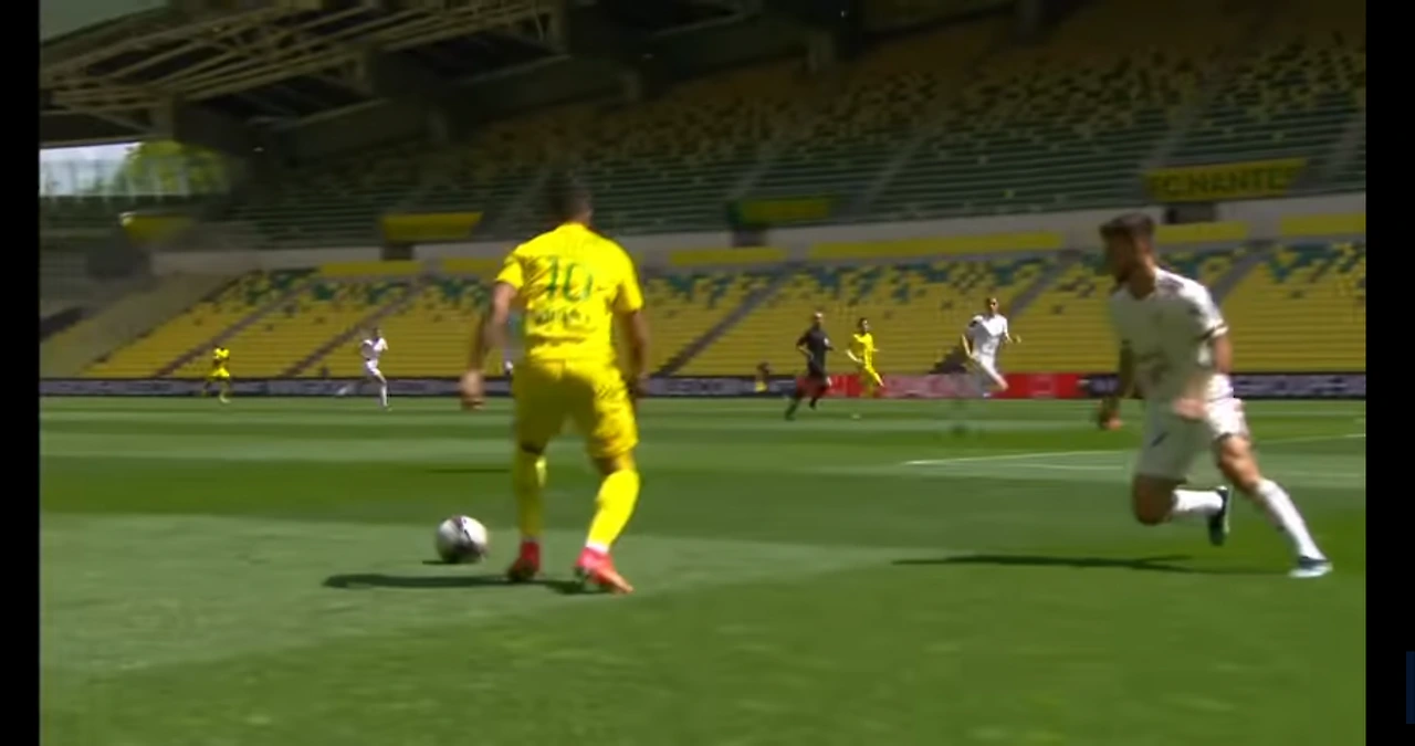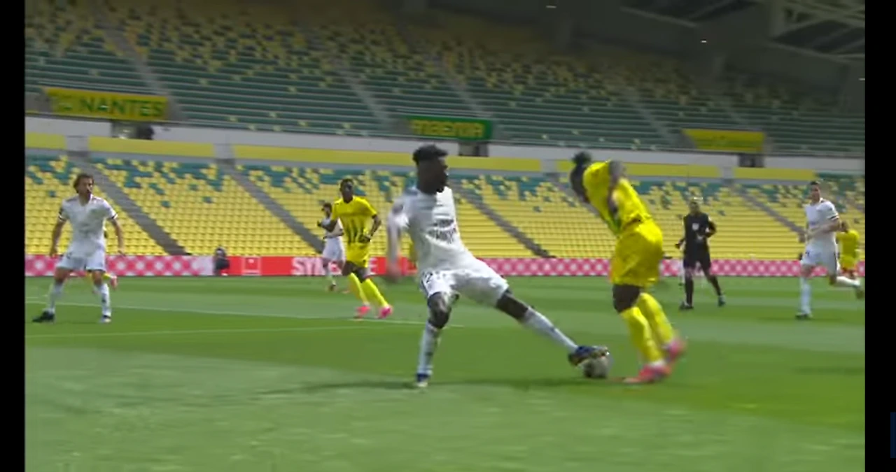 보르도 풀백이 낭트 공격수에게 무너지자 낭트가 득점을 취하고 있는 장면