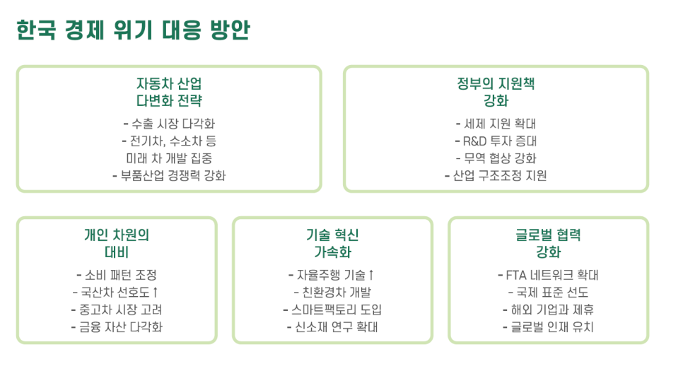 개인 차원: 자동차 구매 계획을 재조정하고, 국내 브랜드와 중고차 시장도 고려.