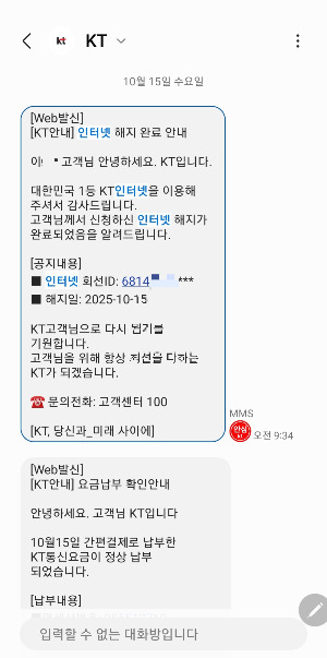 10월 15일, KT로부터 다음과 같은 문자를 받았다.