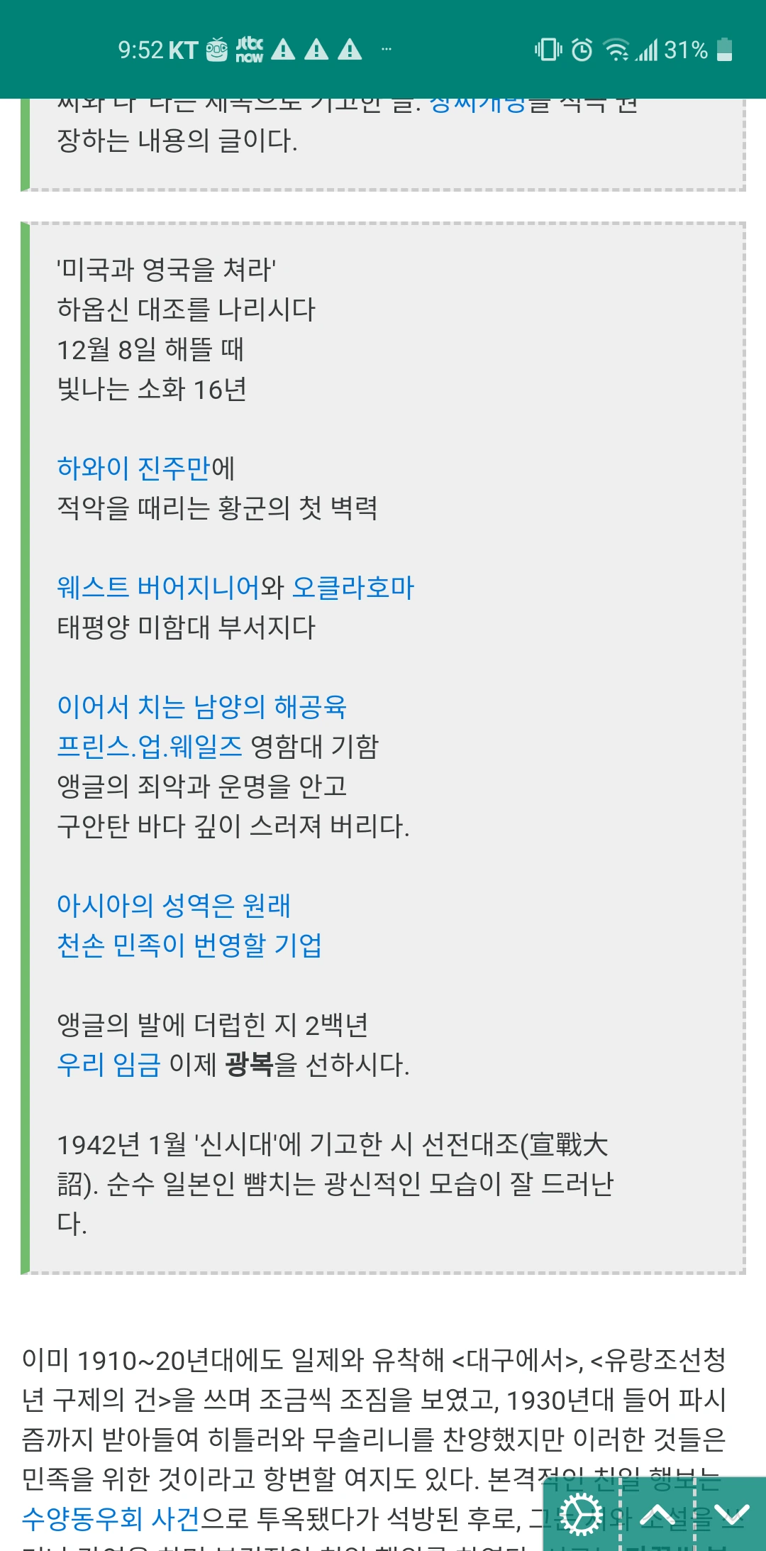 그런 이의 사상이 친일파청산을 하지못해 이 땅에 자리잡았고 한 때는 사회주의 사상에 완전히 심몰되어 주사파에 가까운 행동을 한 이들이 이후 철저히 친일수구분자가 되어 한국에 열등감을 심어주는 말도 안되는 식민지 교육의 부활을 꿈꾸고 있다.