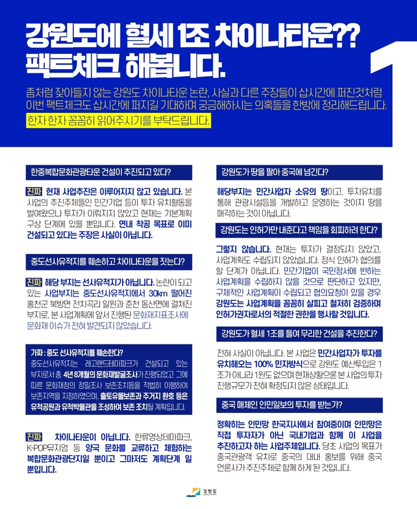 아래는 강원도청의 해명 자료. sns를 통해 차이나타운설에 대해 해명하였다.