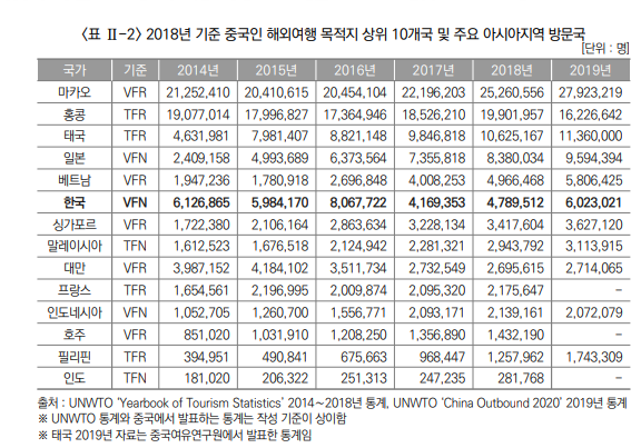 ● 한국은 2016년 약 800만 명의 중국인이 방문하는 등 방한 중국인이 전체 방한 규모의 절반가량을 차지하며 지속적인 성장세를 보였으나, 2017년은 사드 이슈로 중국인 단체 방한관광이 제한되면서 전년 대비 절반수준인 417만 명에 그쳤다. 이후 쇼핑, 의료, 한류 관련 방한관광을 중심으로 높은 방한 관광 수요를 보여, 2018년 479만 명, 2019년 602만 명의 중국인이 방문하였다