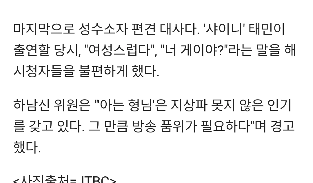 필자는 예능을 좋아한다. 특히 아는 형님이라는 프로그램을 즐겨보는데, 그 이유는 거침없는 입담과 유쾌함, 멤버들간 조화가 좋아서였다. 문제가 되었던 것은 50화였다. 이때 김희철이 샤이니 멤버 태민에게 '여성스럽다'라 놀리기 시작했고 여기에대해서 방송 후 엄청난 팬들의 비난이 있었다. 그리고 여기에대해 방통위에서는 아는 형님에대해 중징계를 내린다. 성소수자를 모독하는 말이라고 설명을 덧붙이면서..