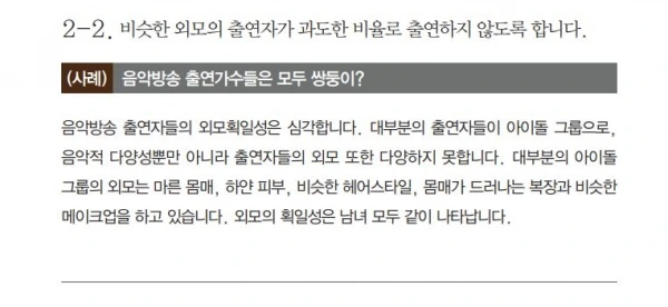 실제 블랙리스트 문건 중 일부 최근에는 여성가족부에서 발행한 '성평등 방송프로그램 제작 안내서(2019)'가 대표적이다. 재밌는건 위에 말했던 줏대없는 도덕적 잣대를 여기서는 정책화하여 상대를 억제하고자 한다.