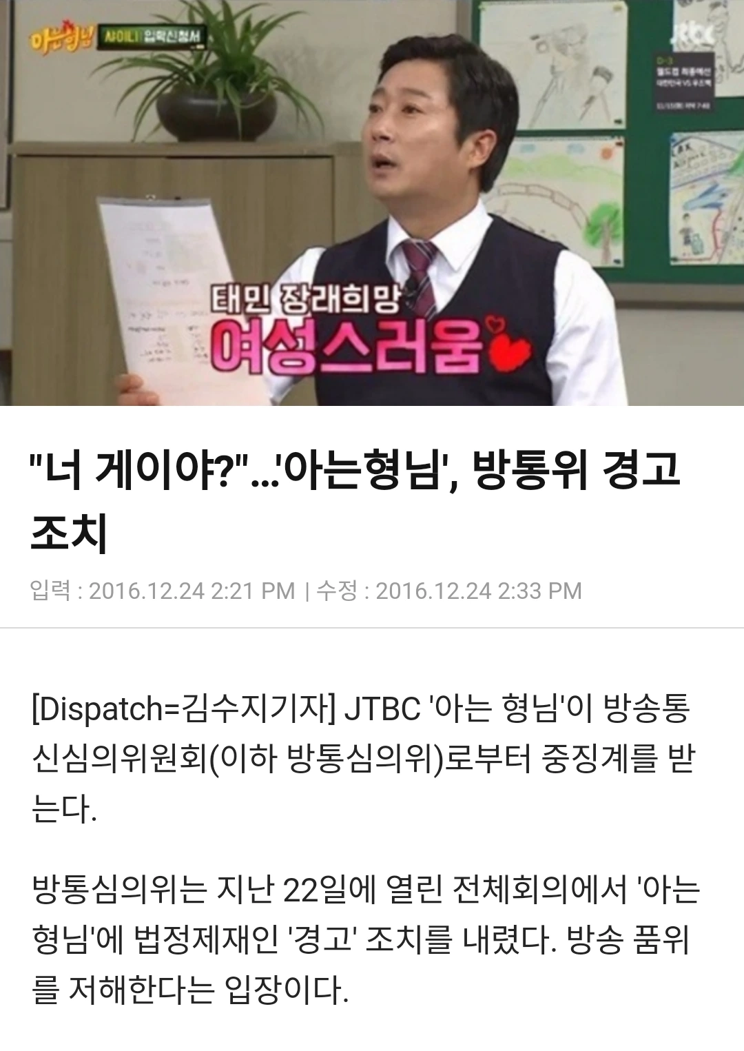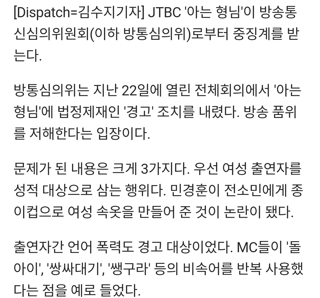 게스트에따라 시청률이 달라지는 여느 평범한 프로그램과 다를게 없어져버린 것이다. 내가 하고 싶은 말은 도대체 위에서 방통위에서 지적한 방송 품격의 기준이 무엇이라는 것이다. 위에서 나온 '도라이, 여성스럽다'란 표현은 일상에서도 너무나 잘 나오는 단어이다. 그런데 저를 화제시하여 자신들의 기준에 맞지않다고하여 방송의 본질적인 컨셉을 바꾸게 하으로써 아는 형님 특유의 캐릭터가 사라지게 만들었다. 그래서 매니아들의 지지를 많이 상실한 상태이다.
