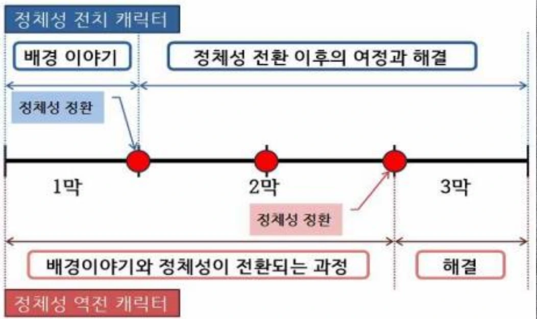 먼저, 이종현 교수의 ‘트랜스아이덴티티 스토리텔링 기반 한국 장르영화 연구’ 논문에서 보면, 아리스토텔레스 및 프로프와 그레마스의 서사구조에 대한 논의를 통해 트랜스아이텐티티 콘텐츠에 대한 정체성 전치 및 정체성 역전 유형 서사구조를 분석하면서 이를 도식화했다. 이 연구는 도식화의 관점에서 시작하는 것이지만, 서사 속에서 변곡점을 통해 인물이 변화하고, 극의 분위기나 서사의 방향이 변하는 것을 중시하고 있다. 따라서 저 정체성 전환, 즉 변곡점이라는 것은 인물과 극의 향방에 있어서 지대한 영향을 끼치는 것인 동시에 극의 도식화를 진행할 수 있는 요소라고 생각할 수 있을 것이다.
