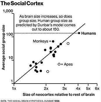 옥스퍼드 대학의 로빈 던바 Robin Dunbar 교수의 연구에 의하면 영장류 집단의 크기는 대뇌피질의 크기와 높은 상관성을 보인다. 뇌가 작은 명주원숭이는 10마리 정도의 무리와 함께 살지만, 대뇌피질이 큰 침팬지의 경우 100마리 정도로 사회가 구성되어 있다. 이러한 상관관계를 우리 인류인 사피엔스의 두뇌 크기를 토대로 계산해보면, 집단 크기는 약 150명 수준으로 계산할 수 있다. 즉 인간은 생물학적으로 150인 정도의 사회를 구성하게 된다. 공교롭게 필자 어린 시절 시골 부락 마을을 가게 되면 친인척들이 있었다. 대략 숫자는 100~200여 분 남짓 계셨던 것 같다.